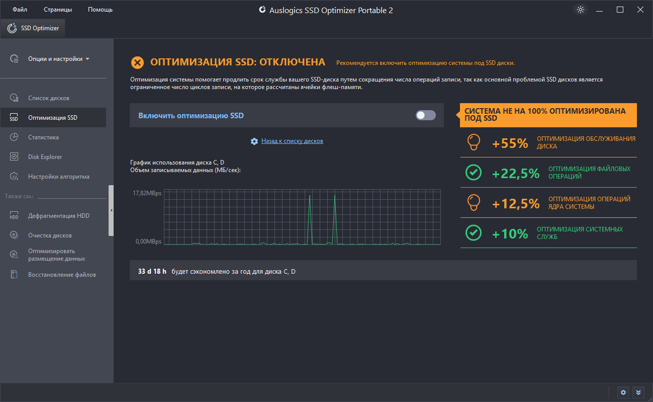Воспользуйтесь основными опциями, позволяющими оптимизировать обслуживание дисков, файловые и системные операции, а также системные службы. Оптимизация SSD помогает сократить количество операций записи и продлить срок службы накопителя.