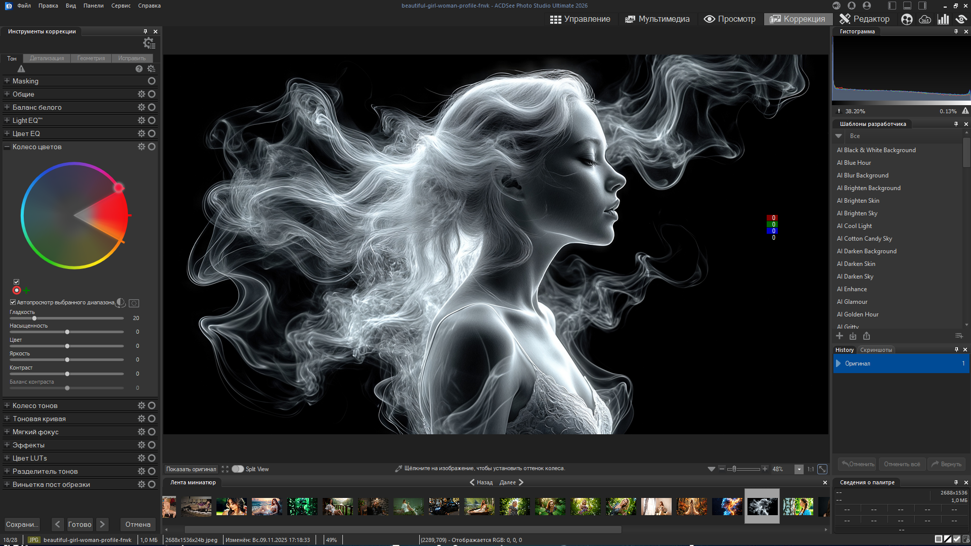 • Точных инструментов для коррекции баланса белого, различных дефектов, резкости и помех;