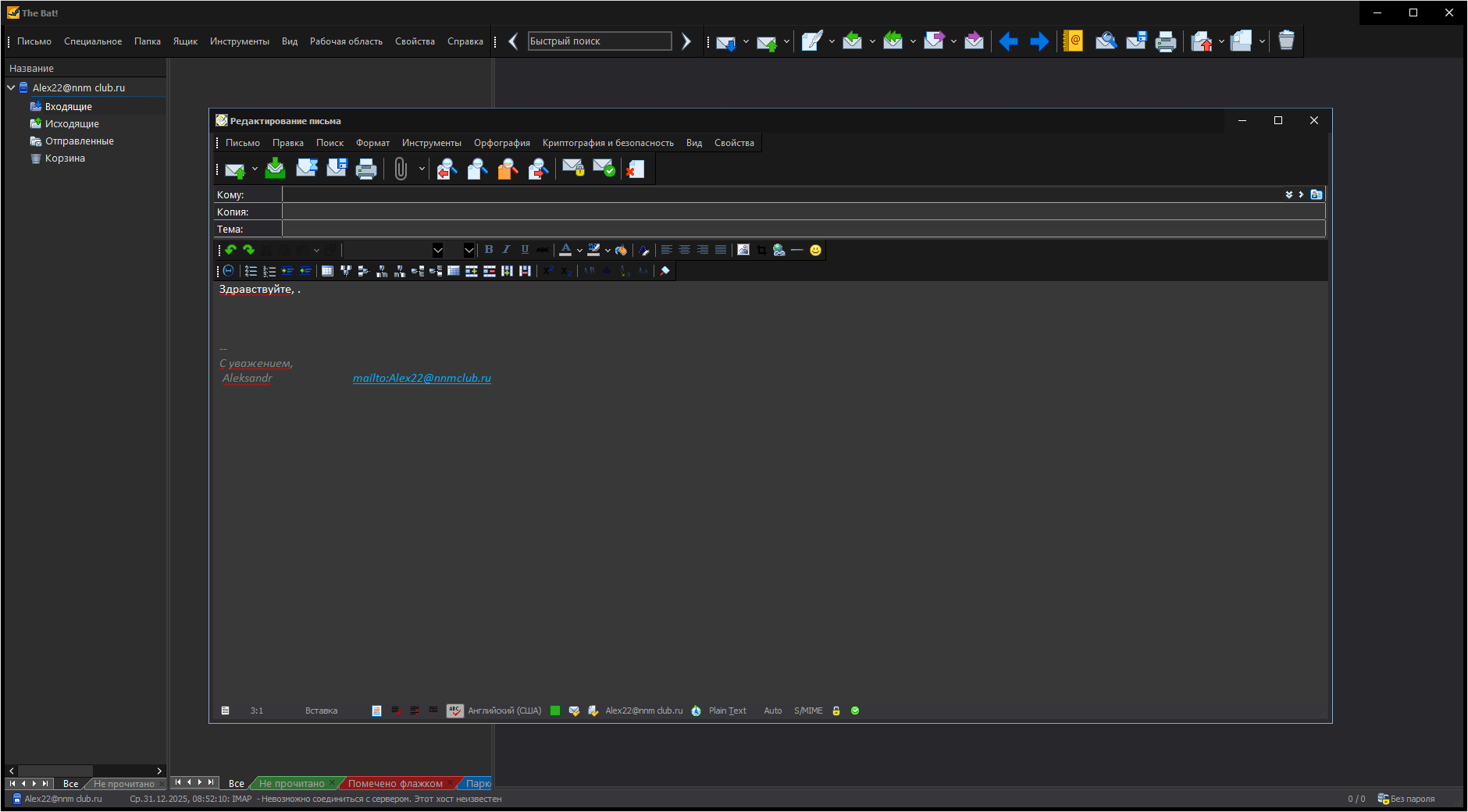 Безопасность личной информации.Отличительная черта TheBat! – самая широкая поддержка протоколов аутентификации и шифрования при работе с почтовыми серверами. The Bat! – один из самых защищенных почтовых клиентов, «состоящий на вооружении» многих компаний, для которых защита приватной информации является вопросом жизни и смерти. Наиболее поздние версии The Bat! оснащены «умными» кнопками безопасности, которые помогают сделать пользовательскую информацию действительно личной. The Bat! надежно защищает вашу почту от сбоев в системе за счет возможности резервного копирования и синхронизации почты, а также от преднамеренного искажения данных и утечки конфиденциальной информации при передаче письма через Интернет. Безопасная аутентификация CRAM-MD5 не позволяет неавторизованным пользователям получить доступ к вашей учетной записи на почтовом сервере.