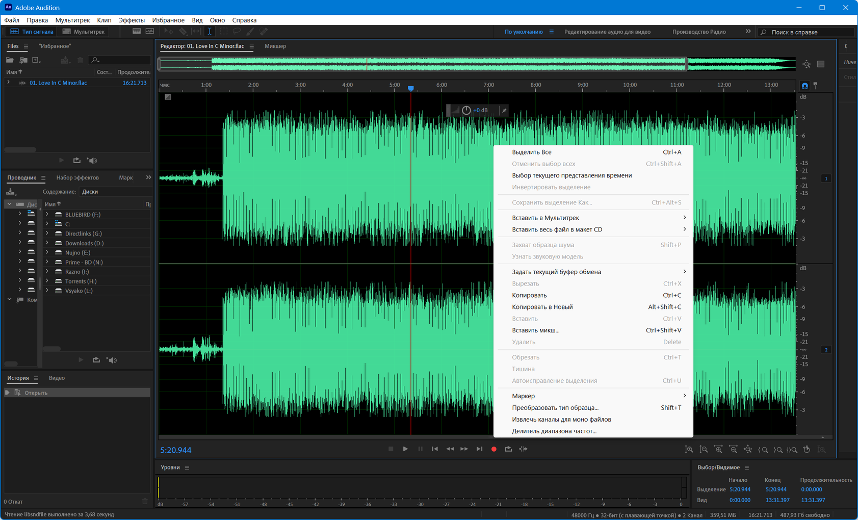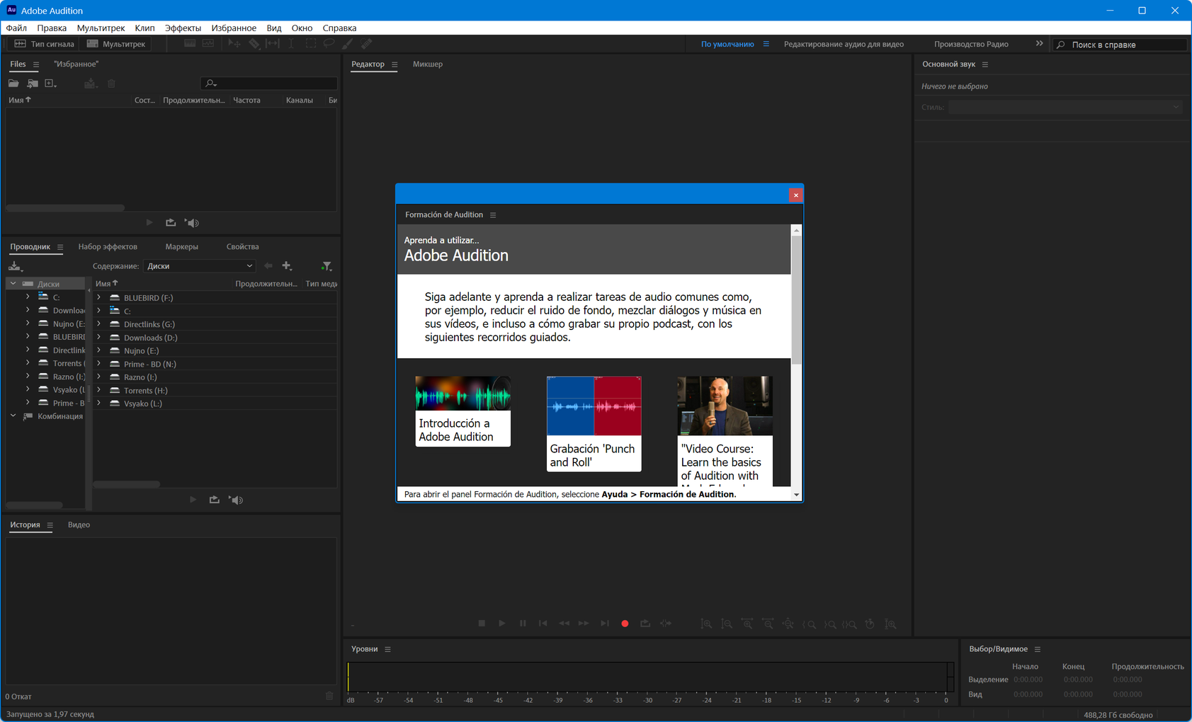 Создавать высококачественную аудио-продукцию- Adobe Audition поддерживает файлы с глубиной оцифровки до 32-бит и частотой дискретизации более 192 КГц, и запись на любые носители (включая магнитную пленку, CD, DVD или DVD-Audio диски). Вся обработка выполняется в 32-битном разрешении, что позволяет достичь высоко профессиональных результатов.