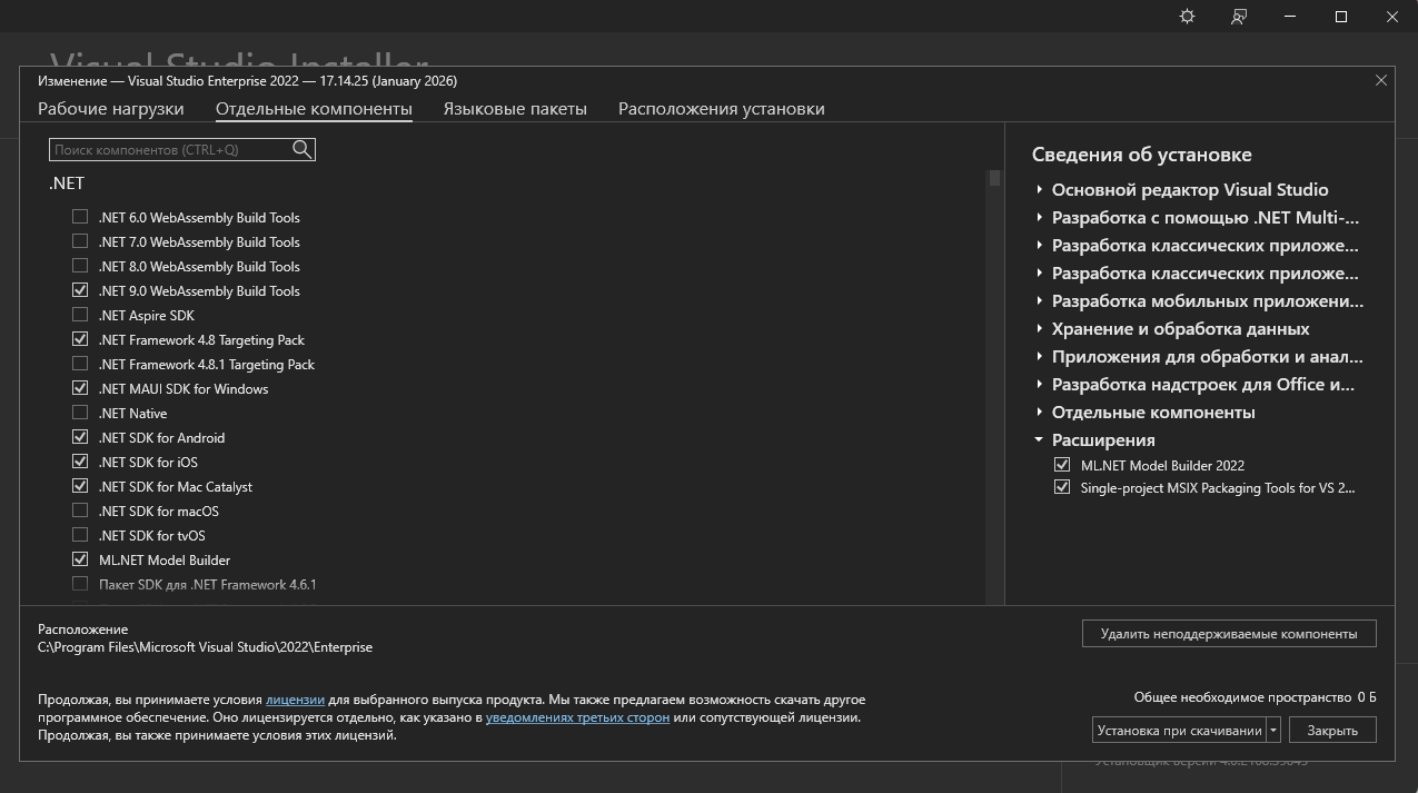 -Для установки Visual Studio требуется .NET Framework 4.7.2 или более поздняя версия . (Для установки Visual Studio версии 17.8 и более ранних версий требуется .NET Framework 4.5.2 или более поздняя версия.) Для работы Visual Studio требуется .NET Framework 4.8. Если .NET Framework 4.8 ещё не установлен, он будет установлен во время установки.