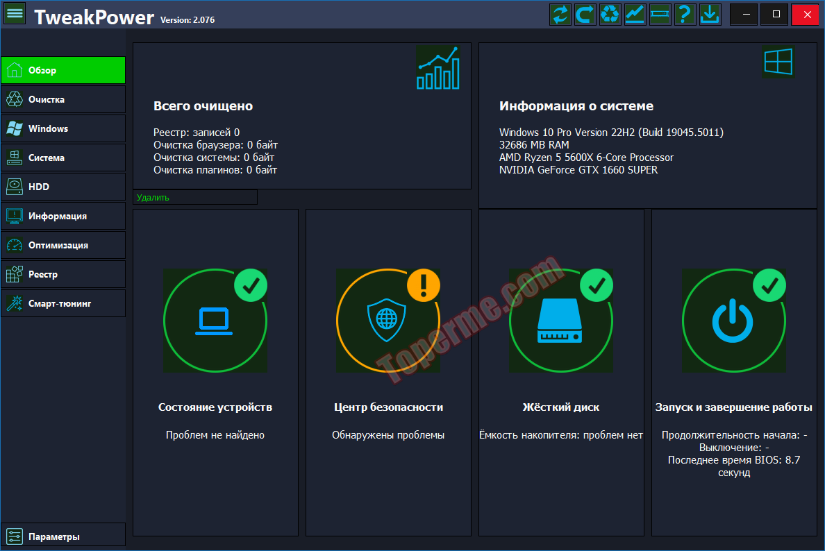 Если вам нужна диагностика системы и выявление ошибок в разных уголках Windows это TweakPower