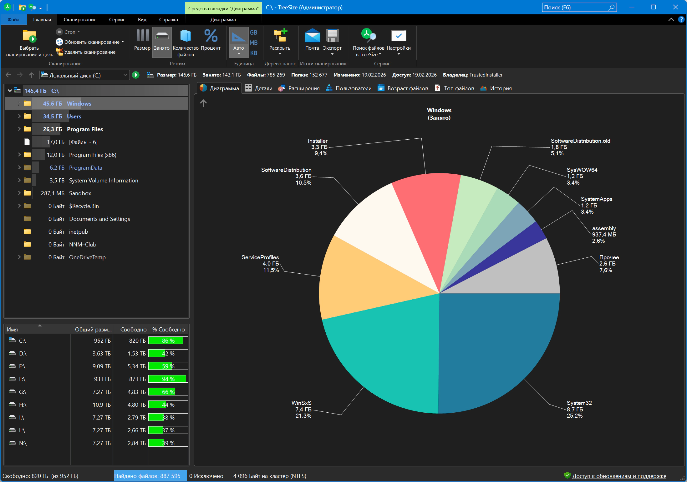 TreeSize — это не просто менеджер файлов, это настоящий "швейцарский армейский нож" в мире управления дисковым пространством, являющийся признанным лидером рынка. Это многофункциональное решение позволяет провести глубокий анализ всех данных, хранящихся в ваших системах, и представить результаты в виде наглядных, информативных диаграмм и статистики.