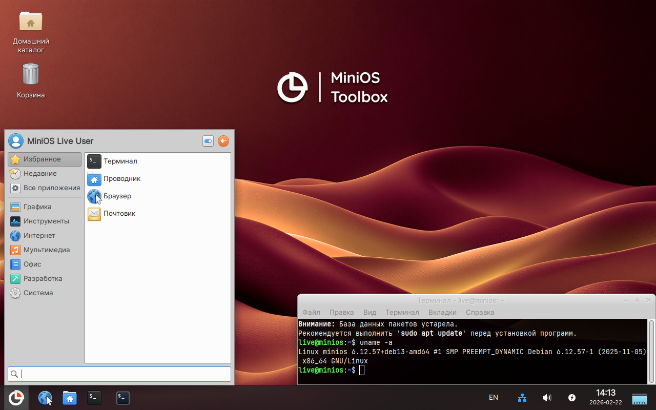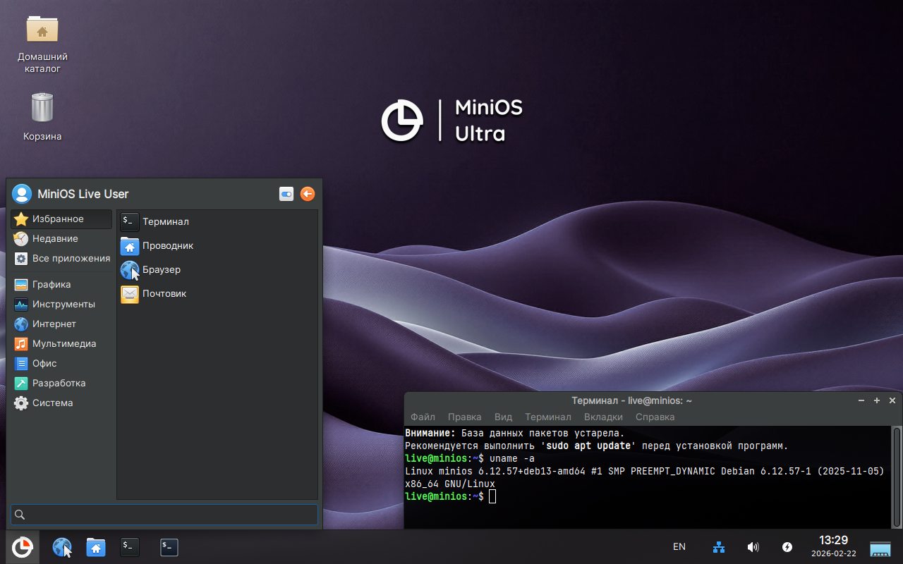 MiniOS Ultra — Полноценное рабочее окружение с широким набором приложений. Профессиональные инструменты для творчества и разработки. Дистрибутивы на Debian 12,13 (x64)