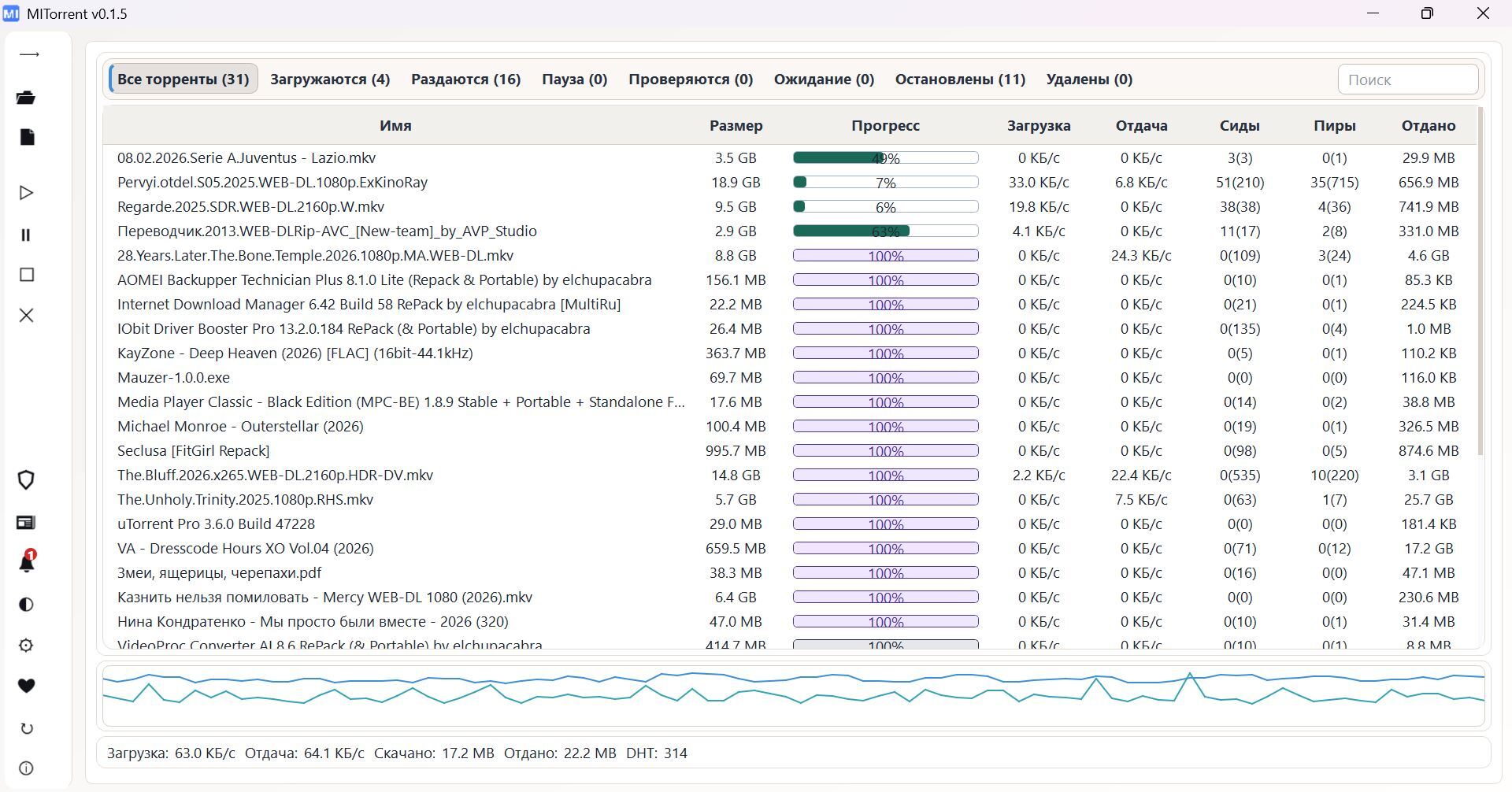 •MITorrent поддерживает параллельные загрузки и раздачи.
