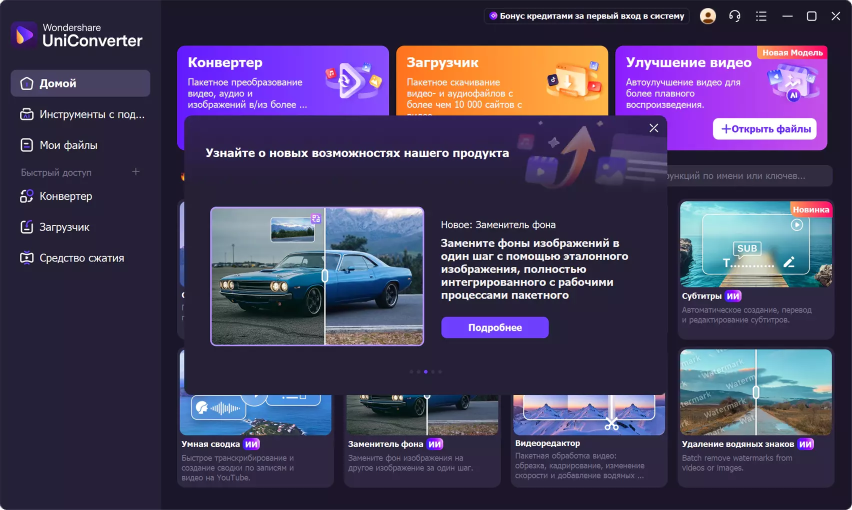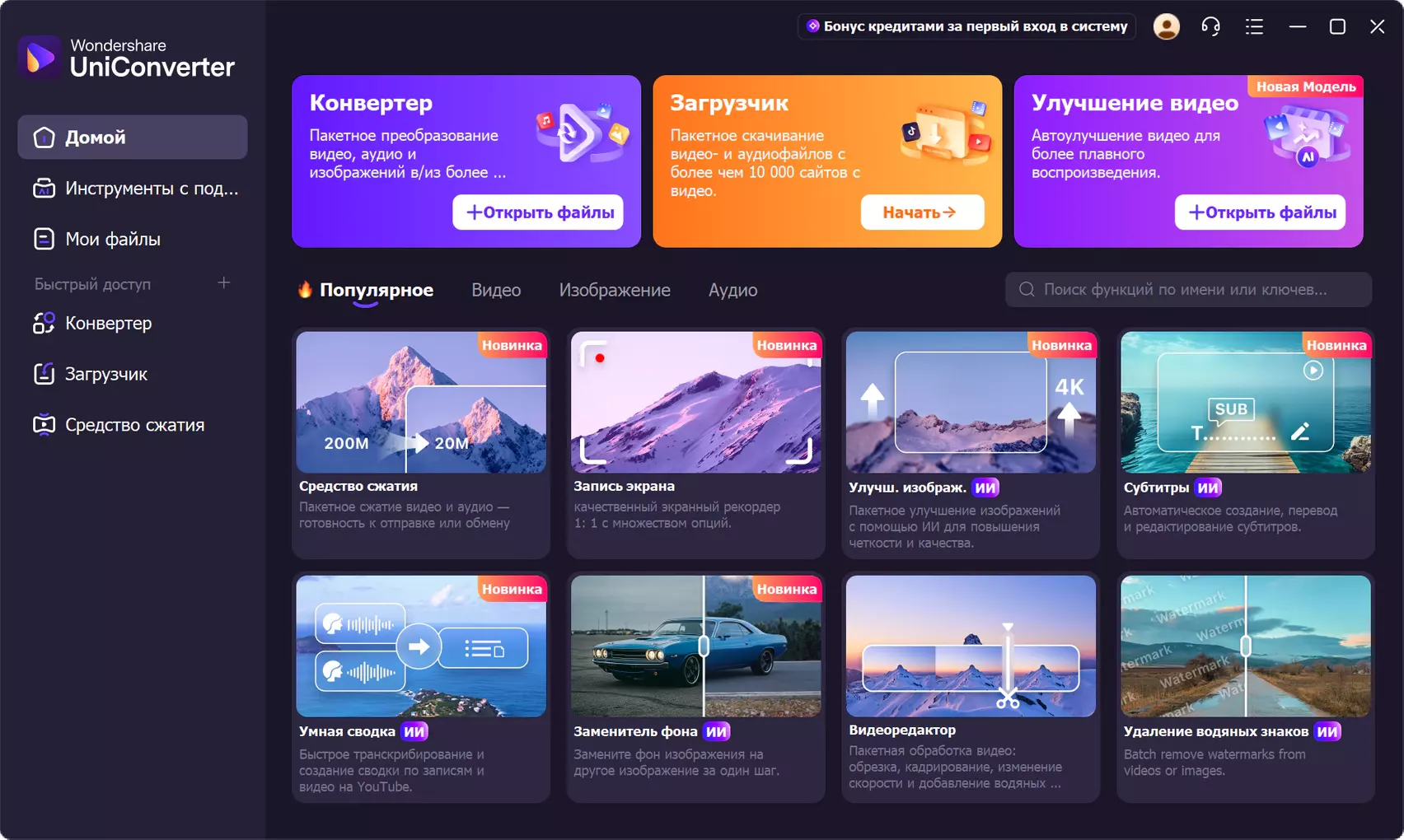 Wondershare UniConverter – это интуитивно понятный видеоконвертер, который предоставляет широкий набор функций для конвертации, редактирования, улучшения, скачивания, записи на диски, организации, захвата видеосигнала и просмотра видео в более чем 159 форматах. Оцените возможности формата 4K и насладитесь непревзойденным качеством изображения! Wondershare UniConverter позволяет конвертировать видео в 1000 форматов с 30-кратной скоростью, сохраняя при этом исходное качество. Благодаря высокой скорости, качеству работы и множеству дополнительных функций, этот видеоконвертер является идеальным решением для работы с видео. Кроме того, Wondershare UniConverter предлагает полный набор оптимизированных инструментов для обработки видео, которые обязательно пригодятся пользователю. Программа отличается простым и привлекательным интерфейсом.