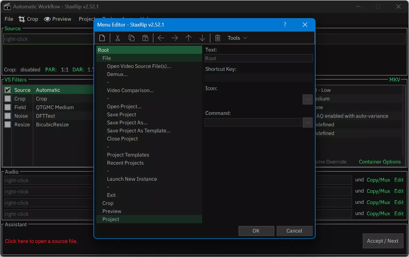 StaxRip — это комплексное решение для кодирования видео, призванное трансформировать ваш контент из Blu-ray, DVD, DVB и других источников в современные форматы, такие как DivX, XviD, H.265 и H.264. Поддерживая широкий спектр видеоконтейнеров (AVI, MP4, MKV, WEBM) и аудиокодеков (MP3, AC3, AAC, DTS и др.), StaxRip предлагает максимальную гибкость. Программа включает аппаратное ускорение кодирования для популярных GPU от AMD, Intel и NVIDIA, а также мощные инструменты для предварительной обработки видео на базе AviSynth и VapourSynth. Гибкие настройки копирования аудио и видео, а также удобные графические интерфейсы для популярных инструментов вроде MP4Box и FFmpeg, делают его идеальным выбором для профессионалов. Более того, StaxRip позволяет создавать высококачественные GIF и APNG анимации, поддерживает пакетную обработку, имеет функцию автоматического обновления, продвинутые опции нарезки и готовые профили для популярных устройств (iPad, iPhone, PS3, Xbox 360), а также интеграцию субтитров.