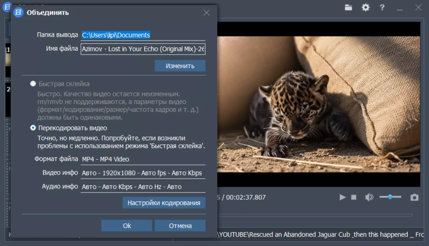 • Объединенное видео может быть в любом видеоформате.
