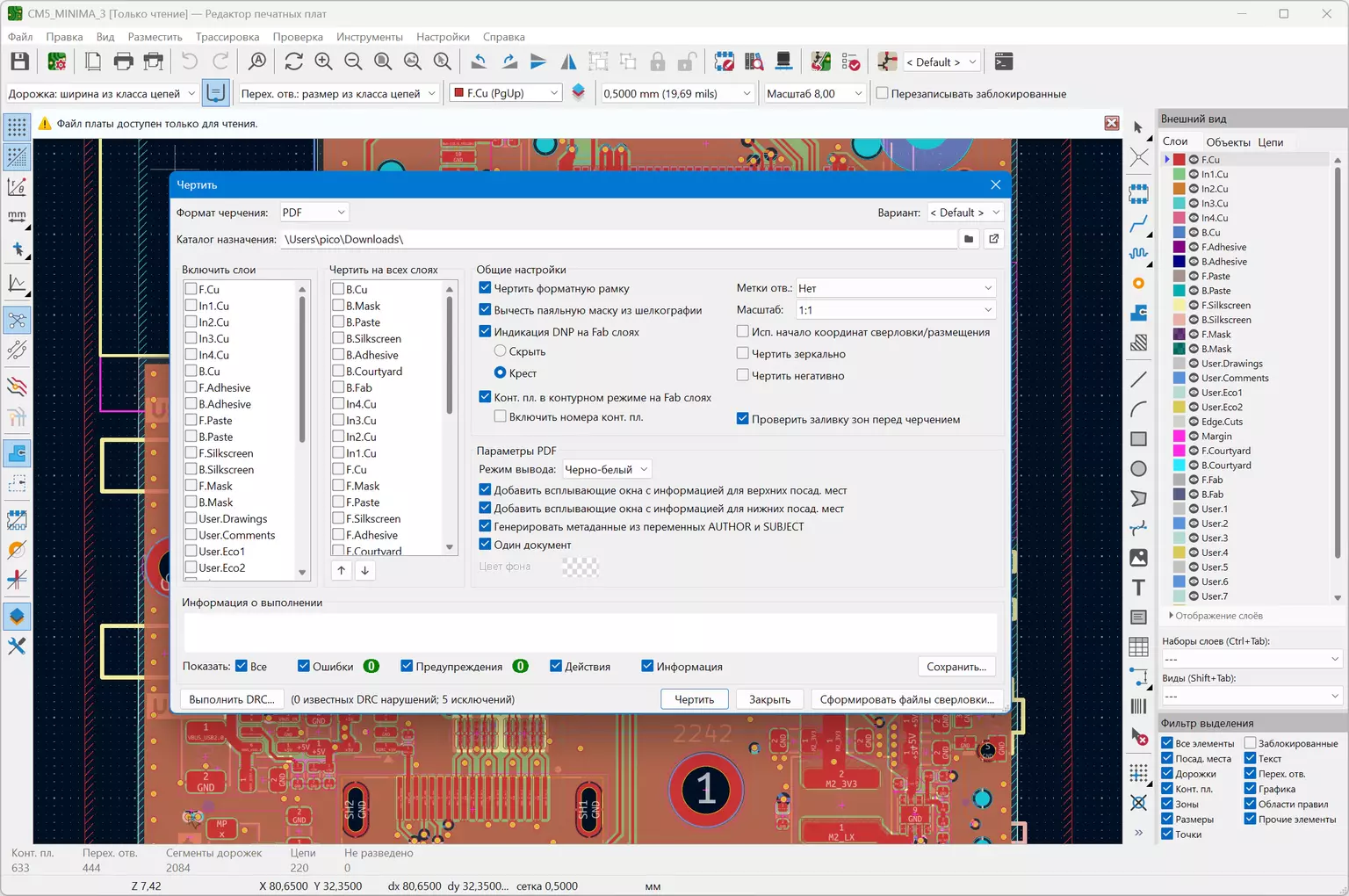 • Просмотр фотошаблонов Gerber (gerbview).