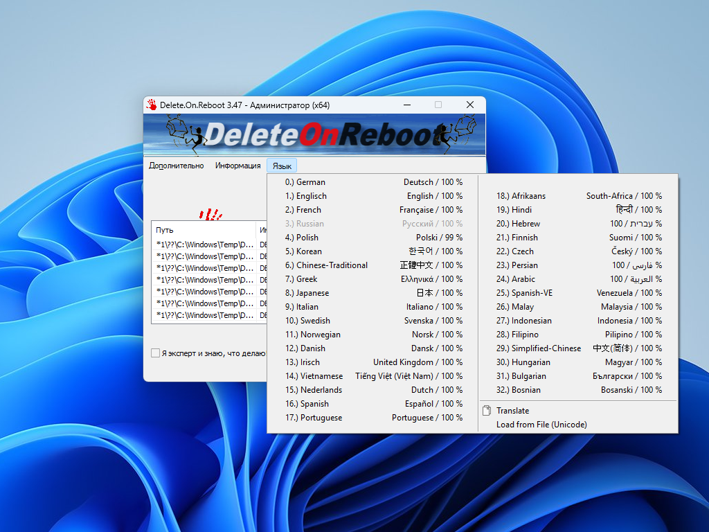 • Для портативного использования, пожалуйста, создайте или скопируйте в рабочую директорию Delete.On.Reboot файл Delete.On.Reboot.ini.