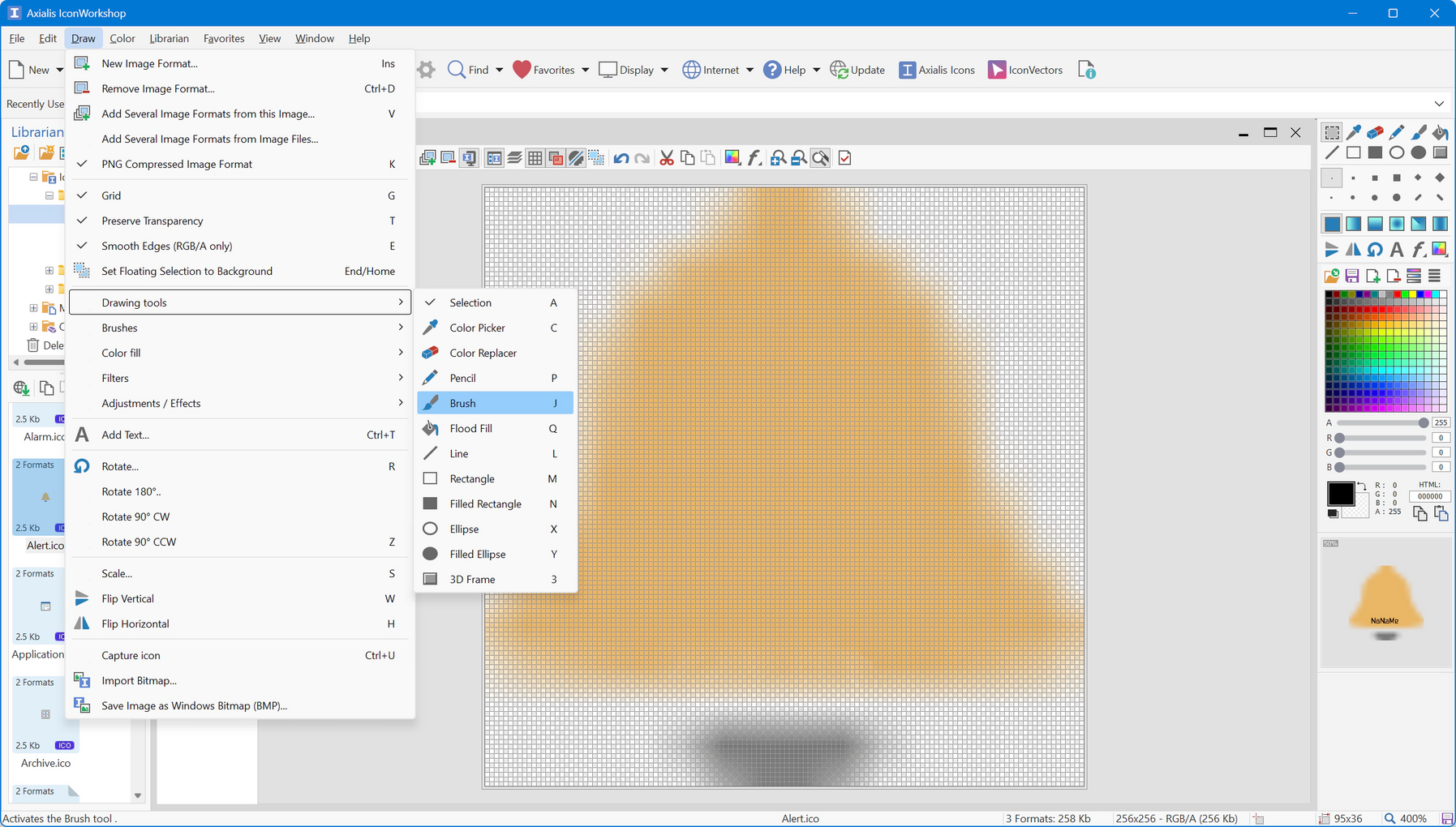 Axialis IconWorkshop™ также позволяет создавать или изменять растровые изображения. Прозрачность поддерживается в изображениях с разрешением 32 BPP с использованием альфа-каналов и в изображениях с разрешением 24 BPP или менее за счет фиксированного цвета фона.
