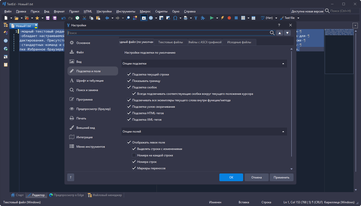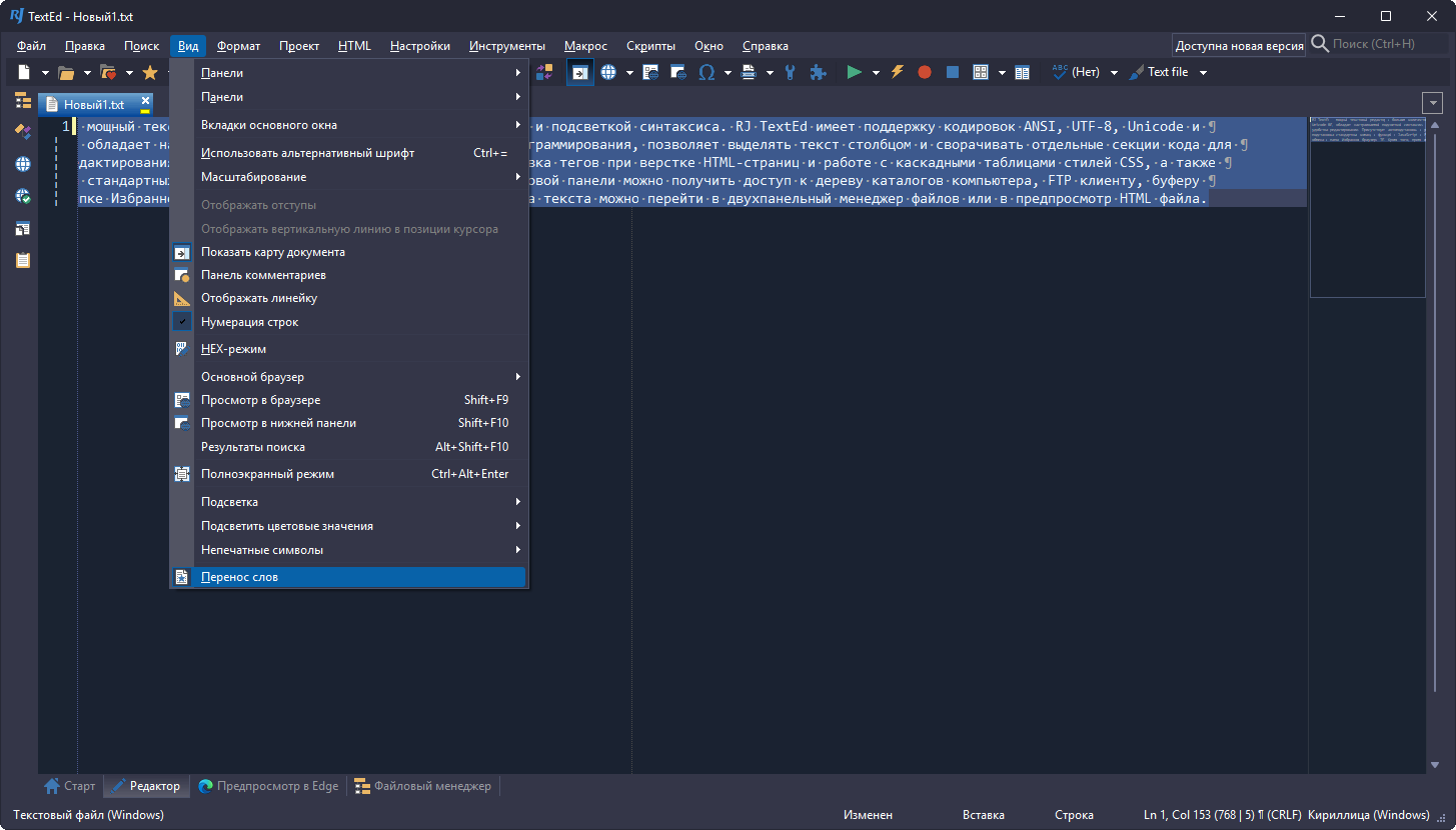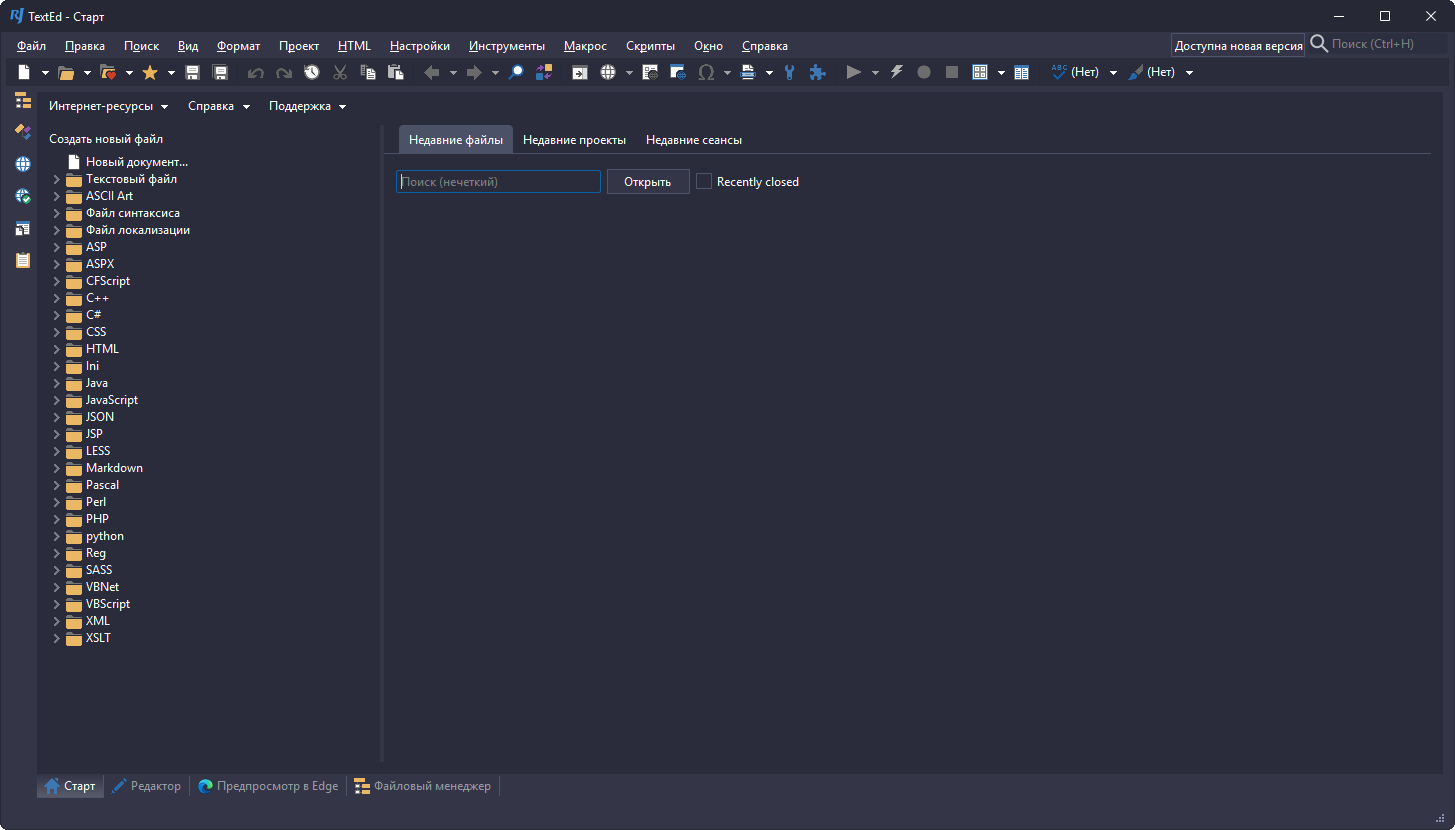 RJ TextEd - мощный текстовый редактор с большим количеством функций и подсветкой синтаксиса. RJ TextEd имеет поддержку кодировок ANSI, UTF-8, Unicode и Unicode BE, обладает настраиваемой подсветкой синтаксиса языков программирования, позволяет выделять текст столбцом и сворачивать отдельные секции кода для удобства редактирования. Присутствует автоподстановка и ручная вставка тегов при верстке HTML-страниц и работе с каскадными таблицами стилей CSS, а также подстановка стандартных команд и функций в JavaScript и PHP. Из боковой панели можно получить доступ к дереву каталогов компьютера, FTP клиенту, буферу обмена и папке Избранное браузера IE. Кроме того, прямо из редактора текста можно перейти в двухпанельный менеджер файлов или в предпросмотр HTML файла.
