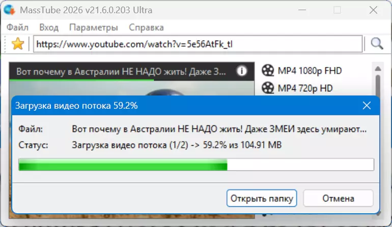 MassTube — простая в использовании утилита, которая делает скачивание видео с YouTube и не только максимально понятным и быстрым. Достаточно вставить адрес понравившегося ролика в строку поиска и нажать поиск — программа мгновенно анализирует доступные форматы и разрешения и предлагает ровно те варианты, которые реально поддерживаются источником. Никаких лишних опций: вы видите только те форматы, которые можно скачать прямо сейчас. Интерфейс минималистичный и понятный, установка не нужна — MassTube запускается сразу. Выберите нужное качество (например, 1080p, 720p) и формат (MP4, WEBM) одним кликом. Поддерживаются и другие площадки помимо YouTube, что делает MassTube универсальным инструментом для разных целей. Утилита автоматически обновляет список поддерживаемых форматов и сайтов, чтобы вы всегда имели актуальные варианты загрузки. Для тех, кто ценит скорость и простоту, MassTube становится надежным спутником: загрузка без лишних действий, без задержек и с минимальным количеством шагов.