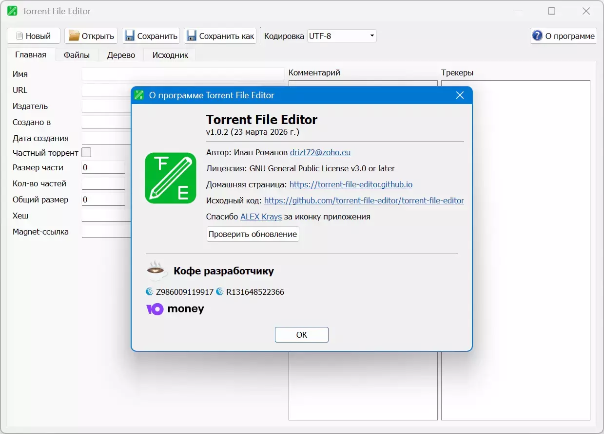 Torrent Editor — это бесплатное кроссплатформенное приложение (Windows, macOS, Linux) для создания и редактирования .torrent файлов и uTorrent .dat. Полная замена устаревшему BEncode Editor с обновленным интерфейсом, расширенными возможностями и полной совместимостью с популярными клиентами (uTorrent, qBittorrent, Transmission и др.).