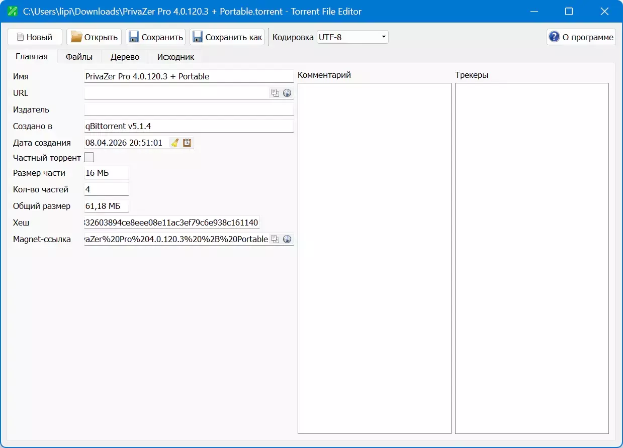 • Изменить информацию о главном .torrent-файле: имя, комментарий, издатель, URL, дату создания, трекеры и автора.