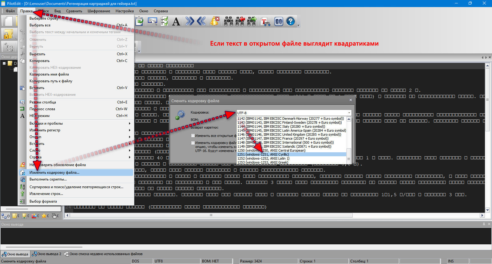 PilotEdit автоматически настроит кодировку текста при копировании/вставке между файлами с разными кодировками.