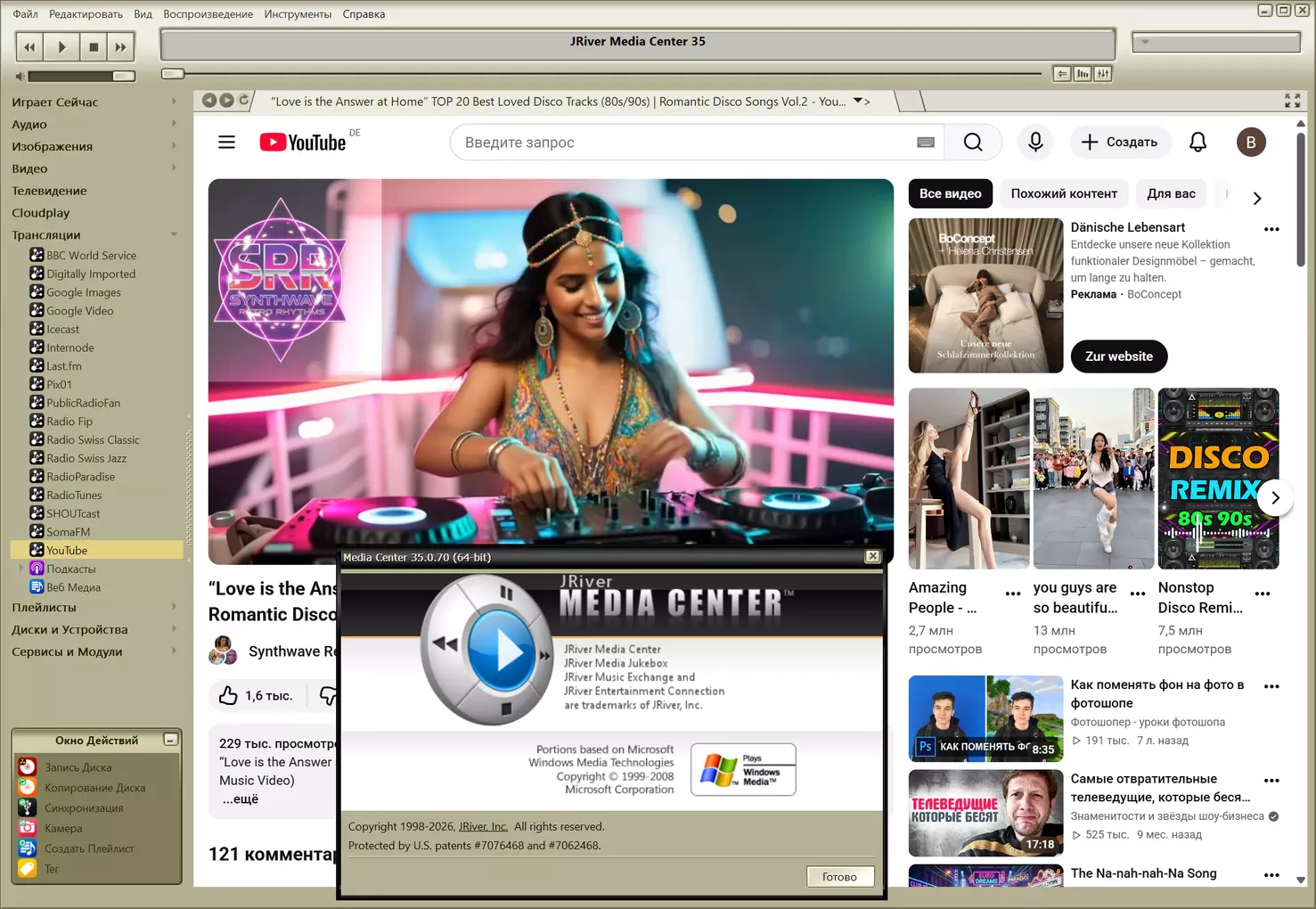Кроме этого, есть очень хороший и мощный по своим возможностям органайзер мультимедийных файлов, медиа редактор, эквалайзер, встроенный DSP и удобный планировщик заданий для автоматизации процессов проигрывания/записи, а также поддержка пульта ДУ. Из необязательных, но приятных функций — становящаяся уже почти стандартом для "приличных" программ возможность изменения внешнего вида с помощью скинов, мини-режим проигрывателя и "телевизор" (c картами ATI). При помощи этой программы вы сможете с помощью компьютера управлять всеми подключенными к нему мультимедиа устройствами. С помощью этой программы вы сможете копировать музыку на портативные цифровые плееры, перемешать цифровые фотографии с камеры в цифровую библиотеку медиа-центра, записывать музыкальные диски, просматривать и записывать любимые телепрограммы и многое другое.