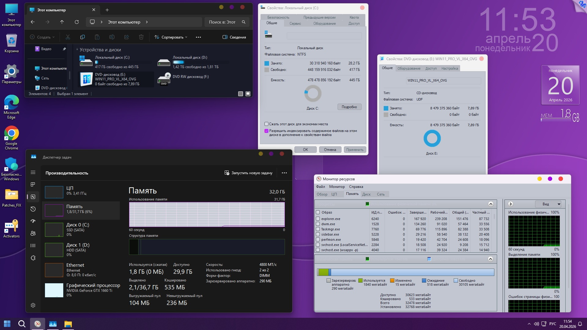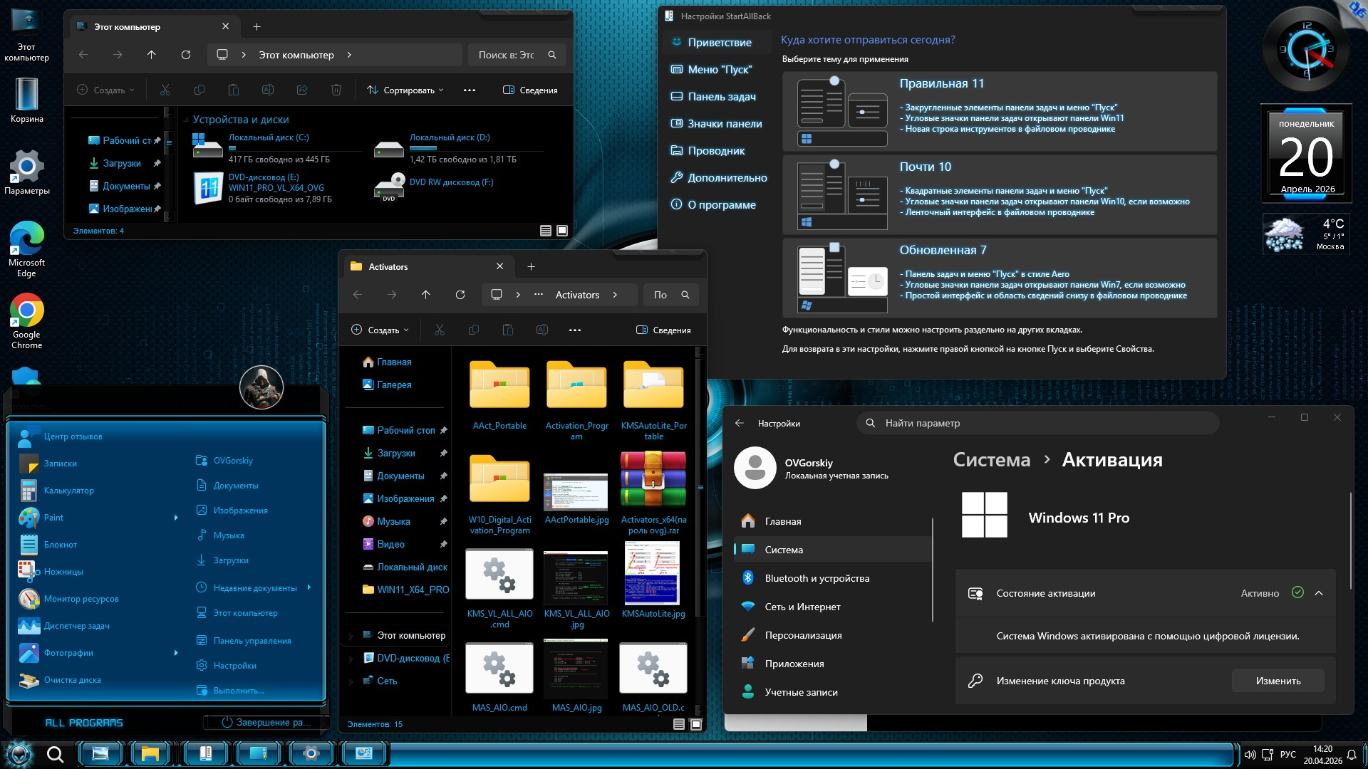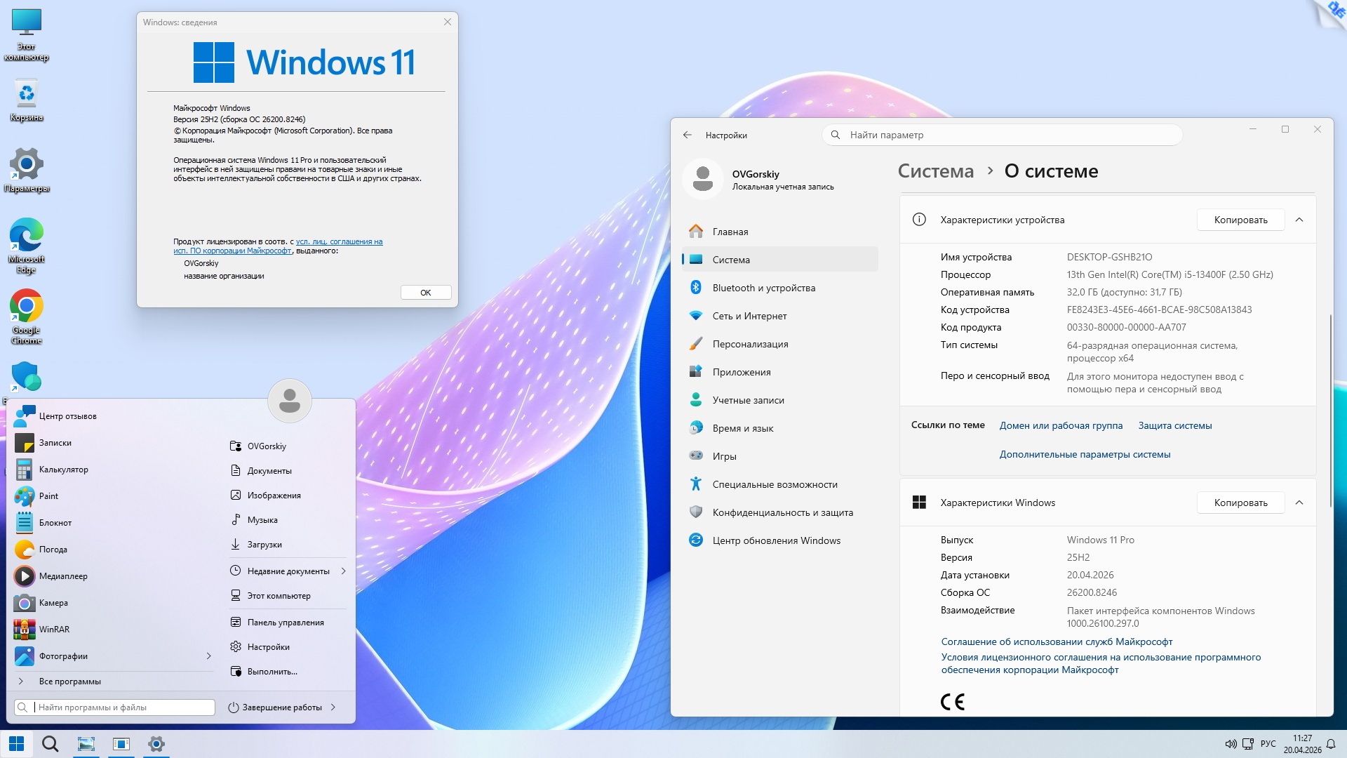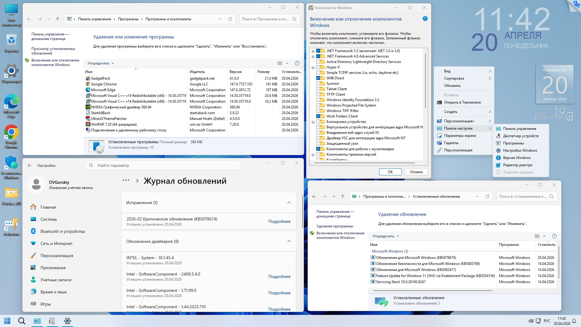 ► Отключены: защитник Windows, автоматическое обновление, контроль учётных записей (UAC), "Новости и Интересы", Recall и SmartScreen (подробнее см. замечания к сборке п.9).