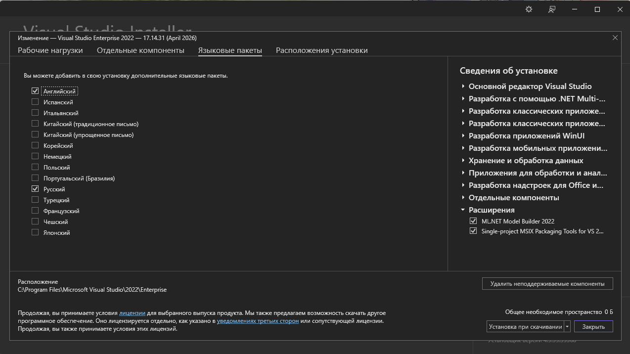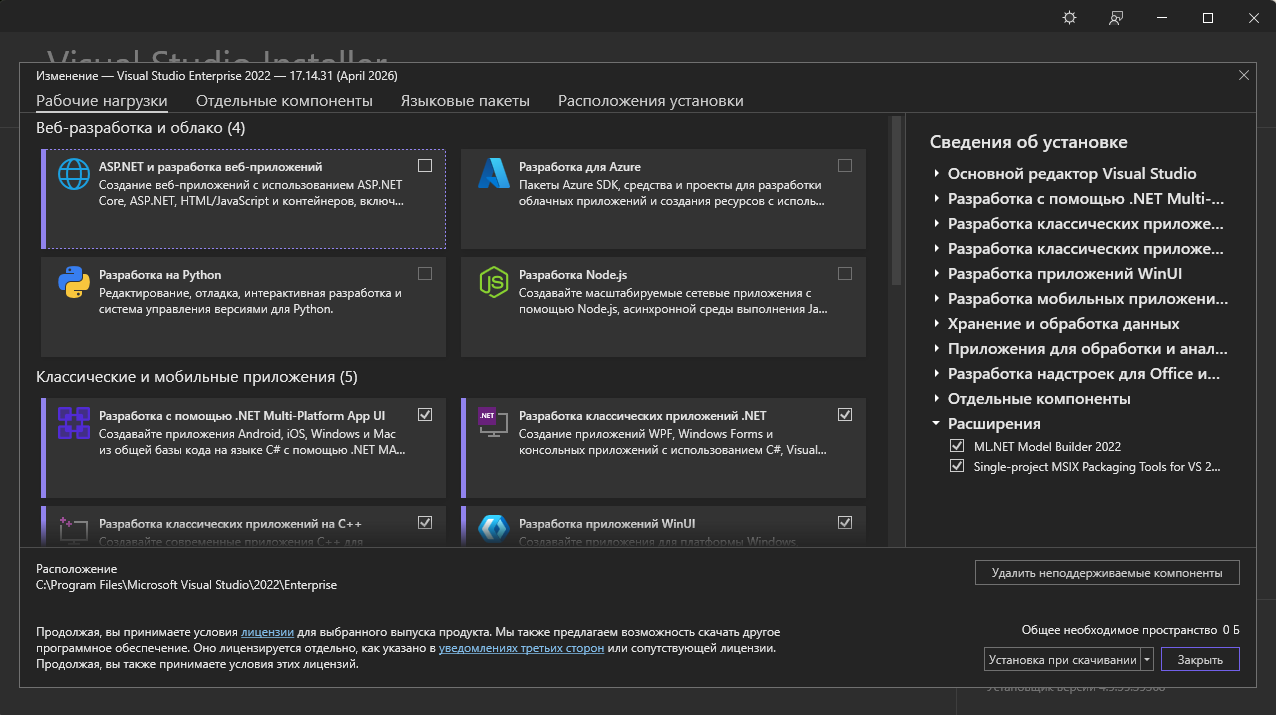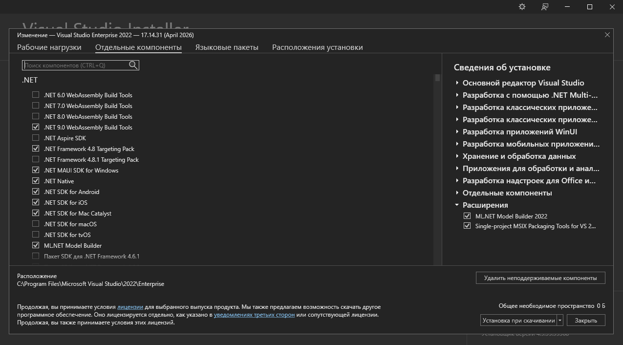 -Для установки Visual Studio требуется .NET Framework 4.7.2 или более поздняя версия . (Для установки Visual Studio версии 17.8 и более ранних версий требуется .NET Framework 4.5.2 или более поздняя версия.) Для работы Visual Studio требуется .NET Framework 4.8. Если .NET Framework 4.8 ещё не установлен, он будет установлен во время установки.