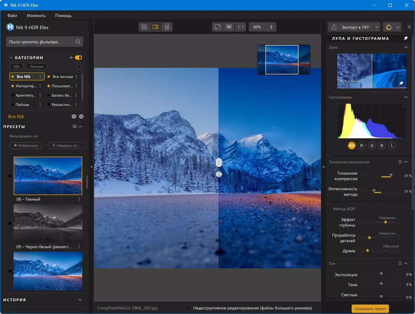 С помощью плагина Nik HDR Efex вы можете объединять изображения с разными настройками экспозиции, чтобы расширить их динамический диапазон и воспроизводить самые тёмные и самые светлые тона на одном изображении. Благодаря 32-битному движку Nik HDR Efex предлагает множество творческих возможностей для создания сюрреалистичных и естественных изображений, поскольку вы можете корректировать полученное изображение глобально и выборочно с помощью локальных настроек.