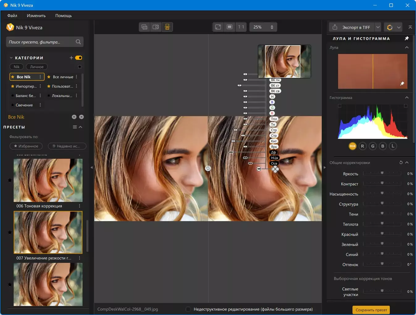 Это инструмент, предназначенный для изменения цветов и тонов (яркости и контрастности) ваших изображений. Как глобально, так и локально. С его помощью вы можете оживить или приглушить цвета, изменив оттенок, насыщенность и яркость; вы также можете изменить контрастность и микроконтрастность ваших изображений.