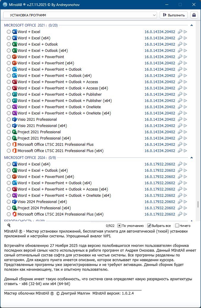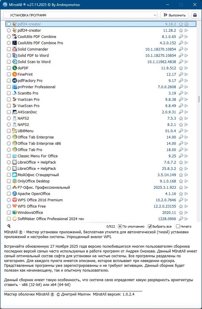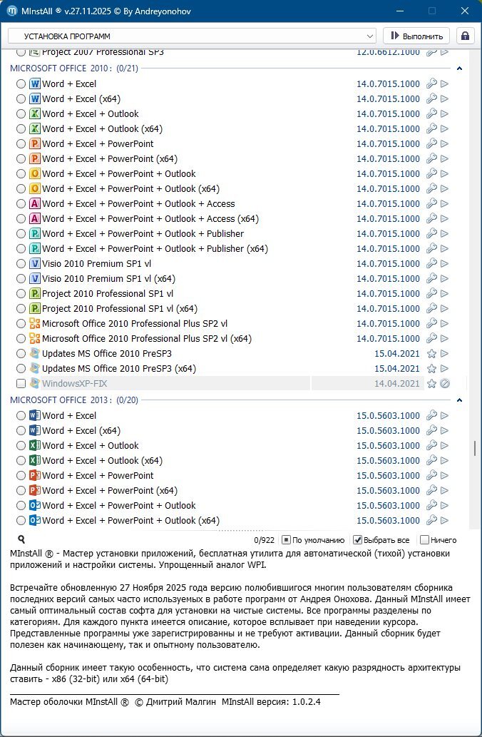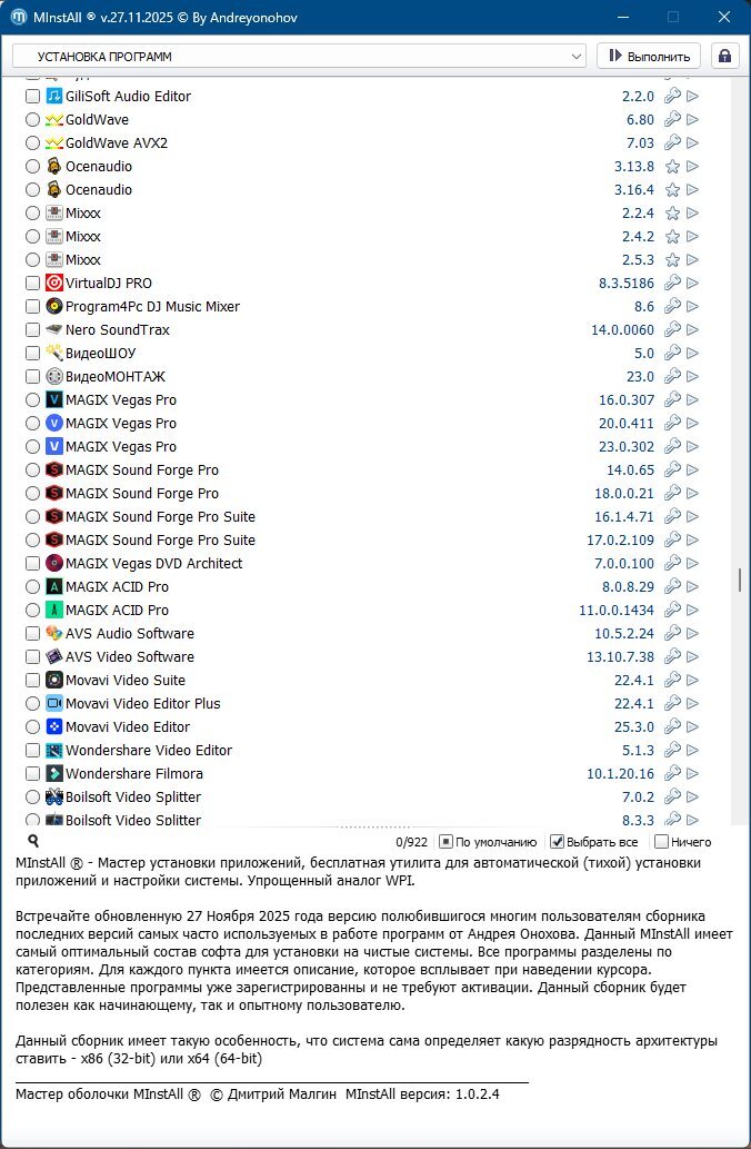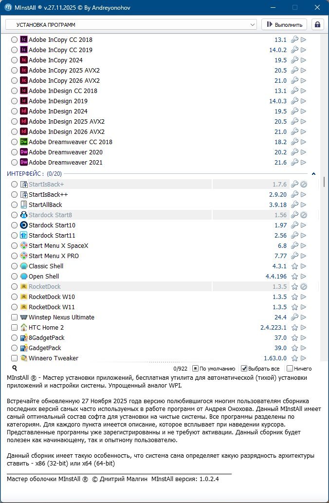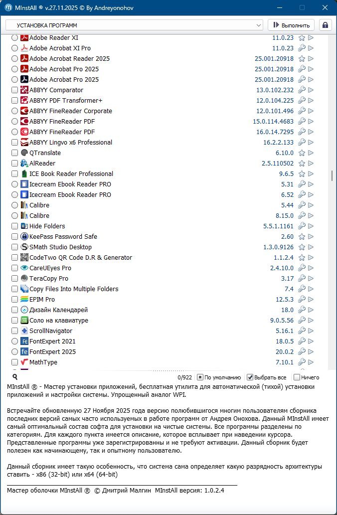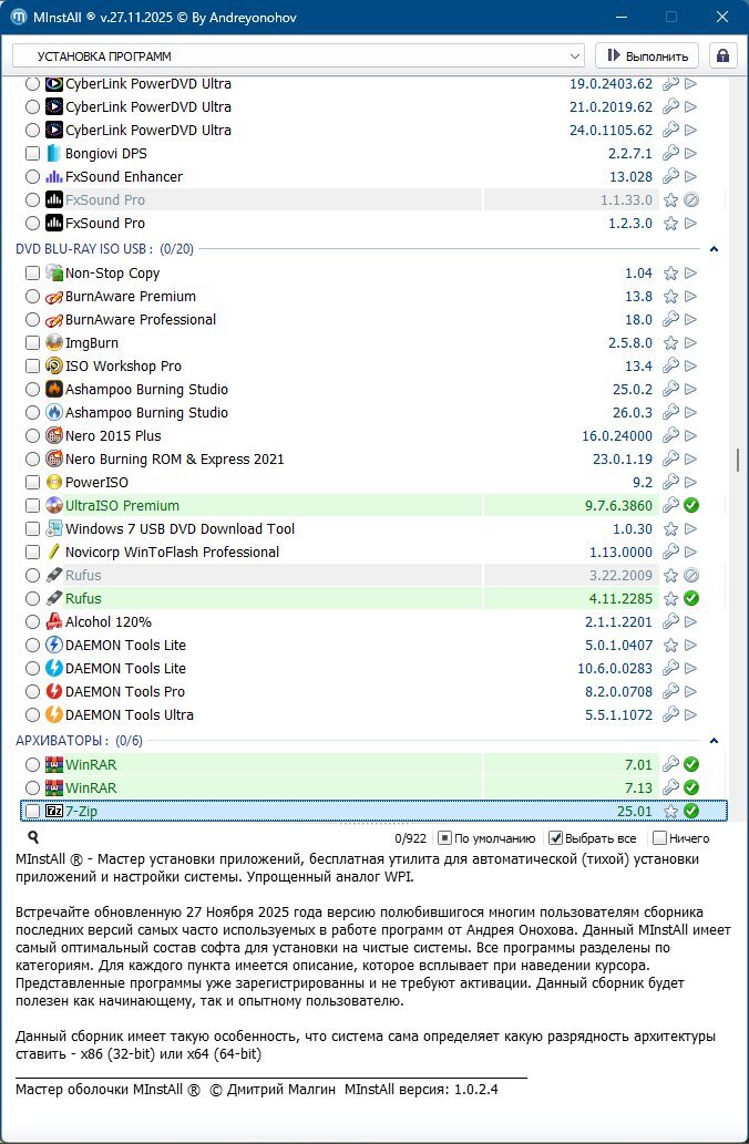 Самый популярный, обновленный 27 Ноября 2025 года полюбившийся многим пользователям сборник последних версий самых часто используемых в работе программ от Андрея Онохова. Теперь в новой, более простой и удобной оболочке MInstAll - это новый мастер установки приложений, упрощенный аналог WPI. Данный MInstAll имеет самый оптимальный состав софта для установки на чистые системы. Представленные программы уже зарегистрированы и не требуют активации.