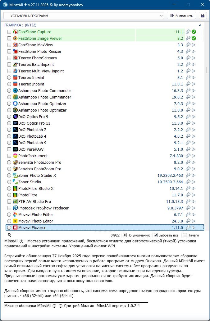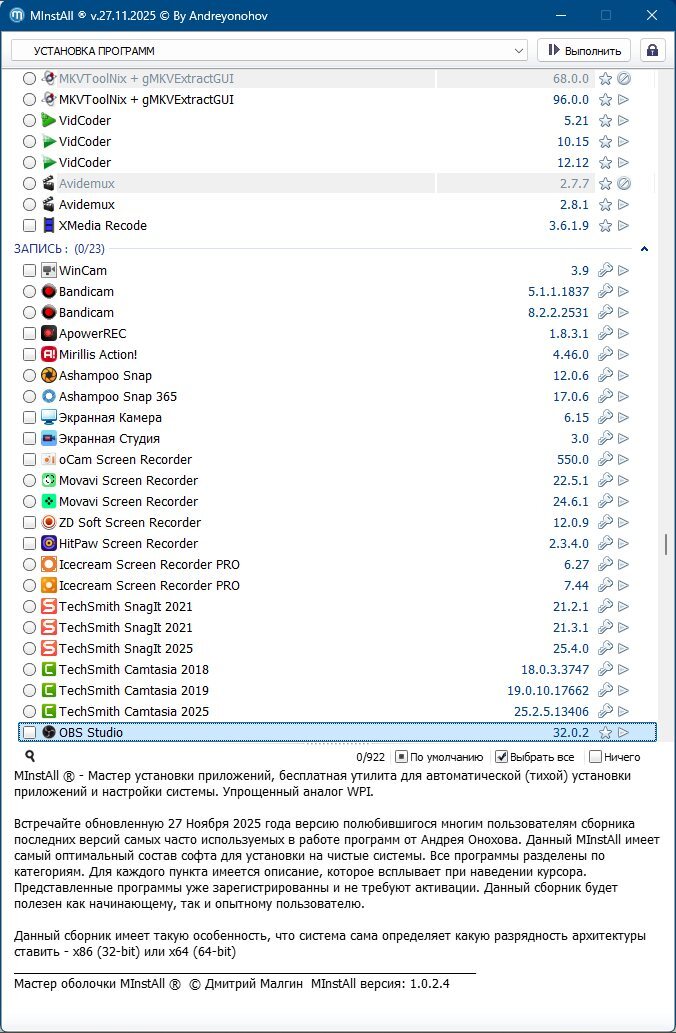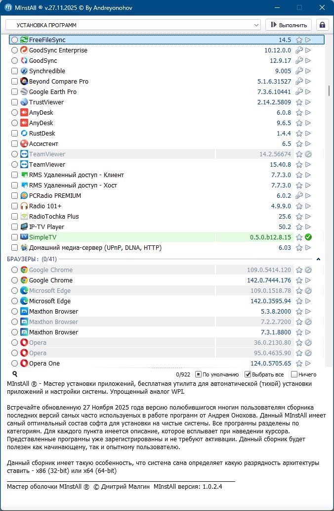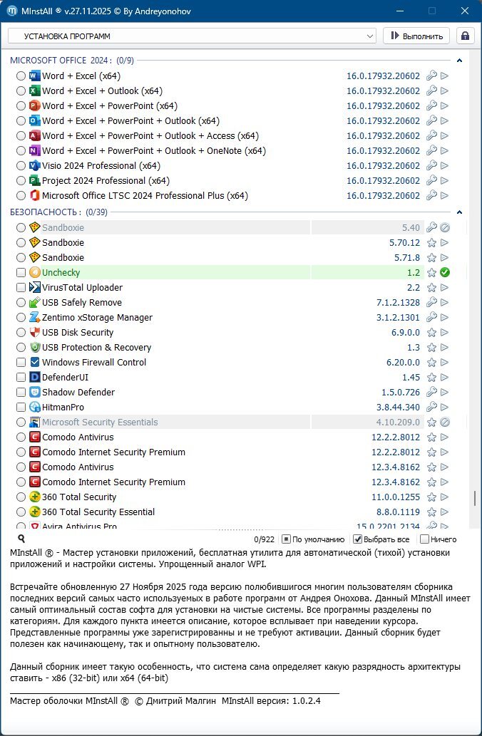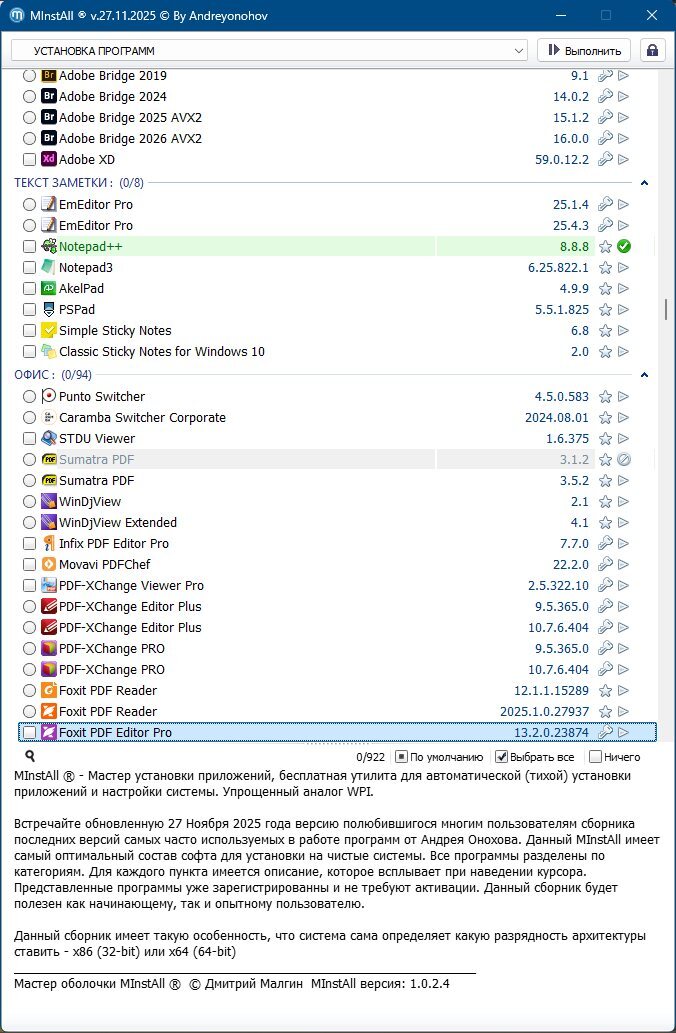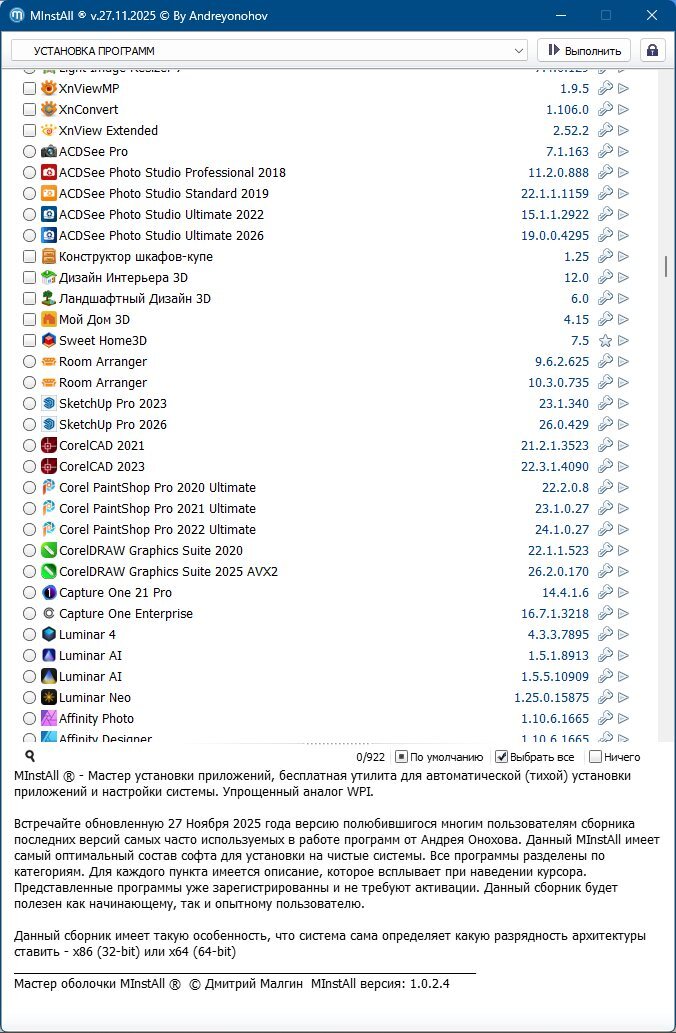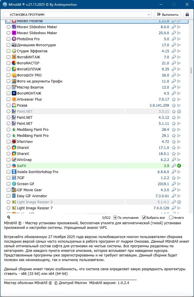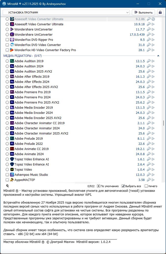 Самый популярный, обновленный 27 Ноября 2025 года полюбившийся многим пользователям сборник последних версий самых часто используемых в работе программ от Андрея Онохова. Теперь в новой, более простой и удобной оболочке MInstAll - это новый мастер установки приложений, упрощенный аналог WPI. Данный MInstAll имеет самый оптимальный состав софта для установки на чистые системы. Представленные программы уже зарегистрированы и не требуют активации.