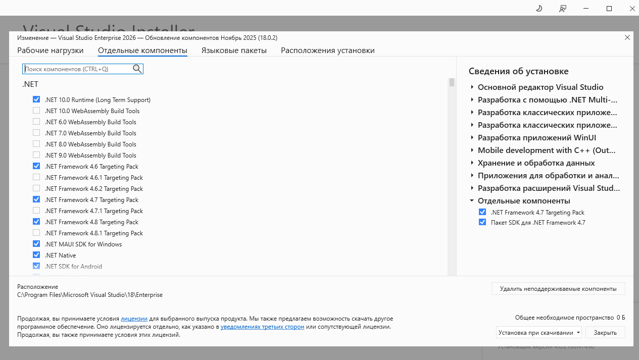 Для установки Visual Studio необходима платформа .NET Framework 4.7.2 или более поздней версии. Visual Studio требует запуска .NET Framework 4.8. Если платформа .NET Framework 4.8 еще не установлена, то будет выполнена ее установка.