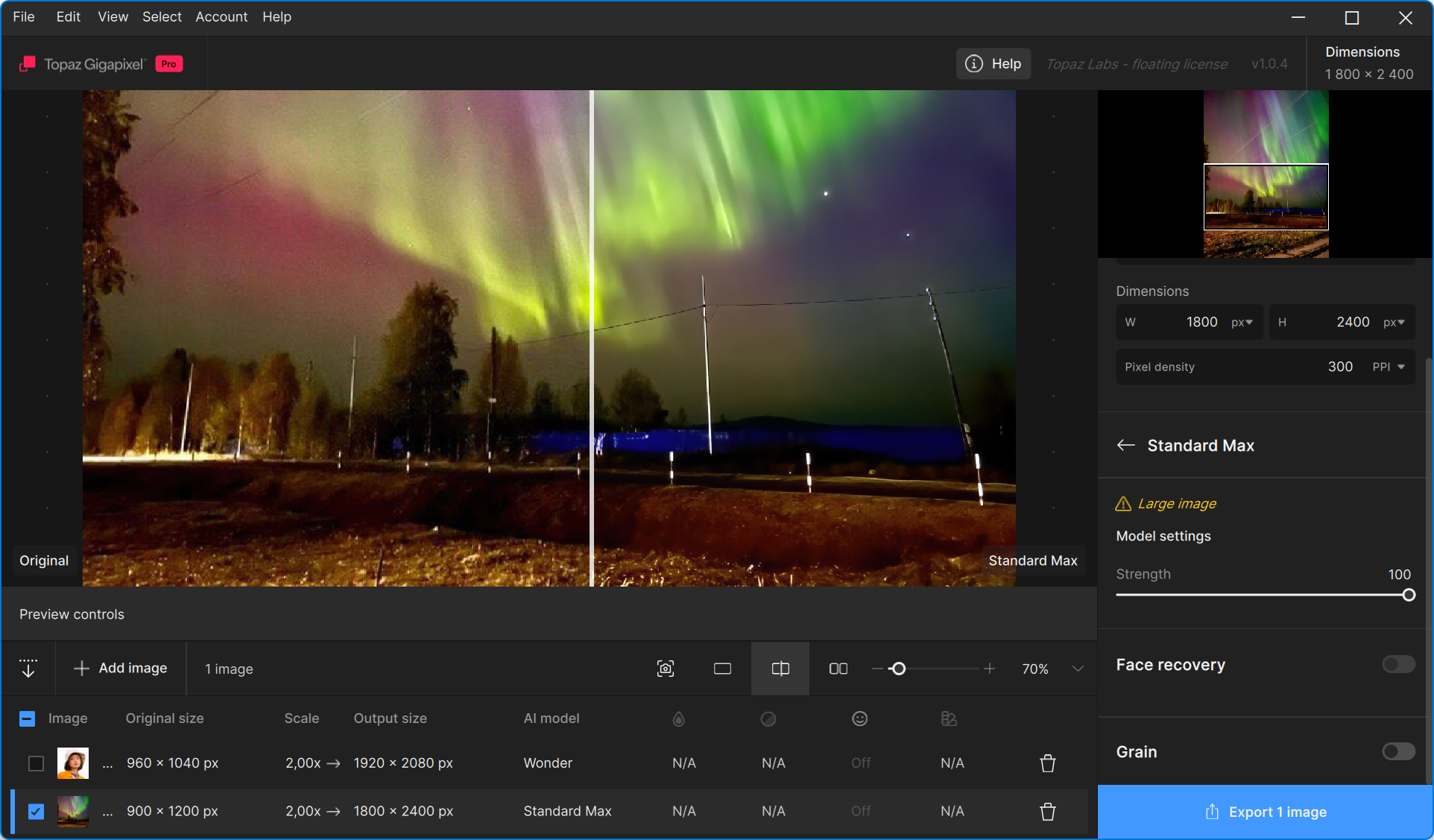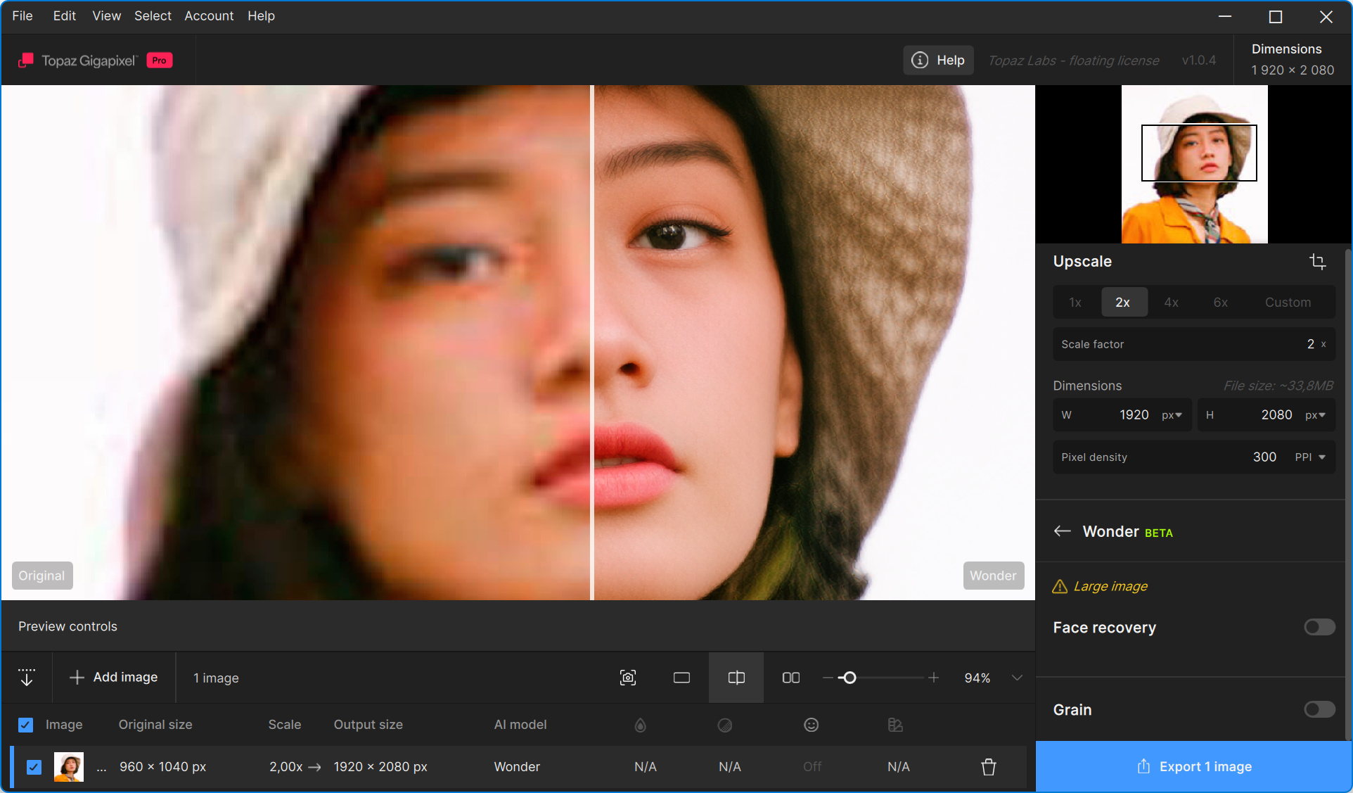 Grain Toggle, который дает пользователям немного больше гибкости в окончательном внешнем виде своих увеличенных изображений, позволяя им сохранить естественные результаты или добавить эстетическую текстуру, соответствующую творческим намерениям.