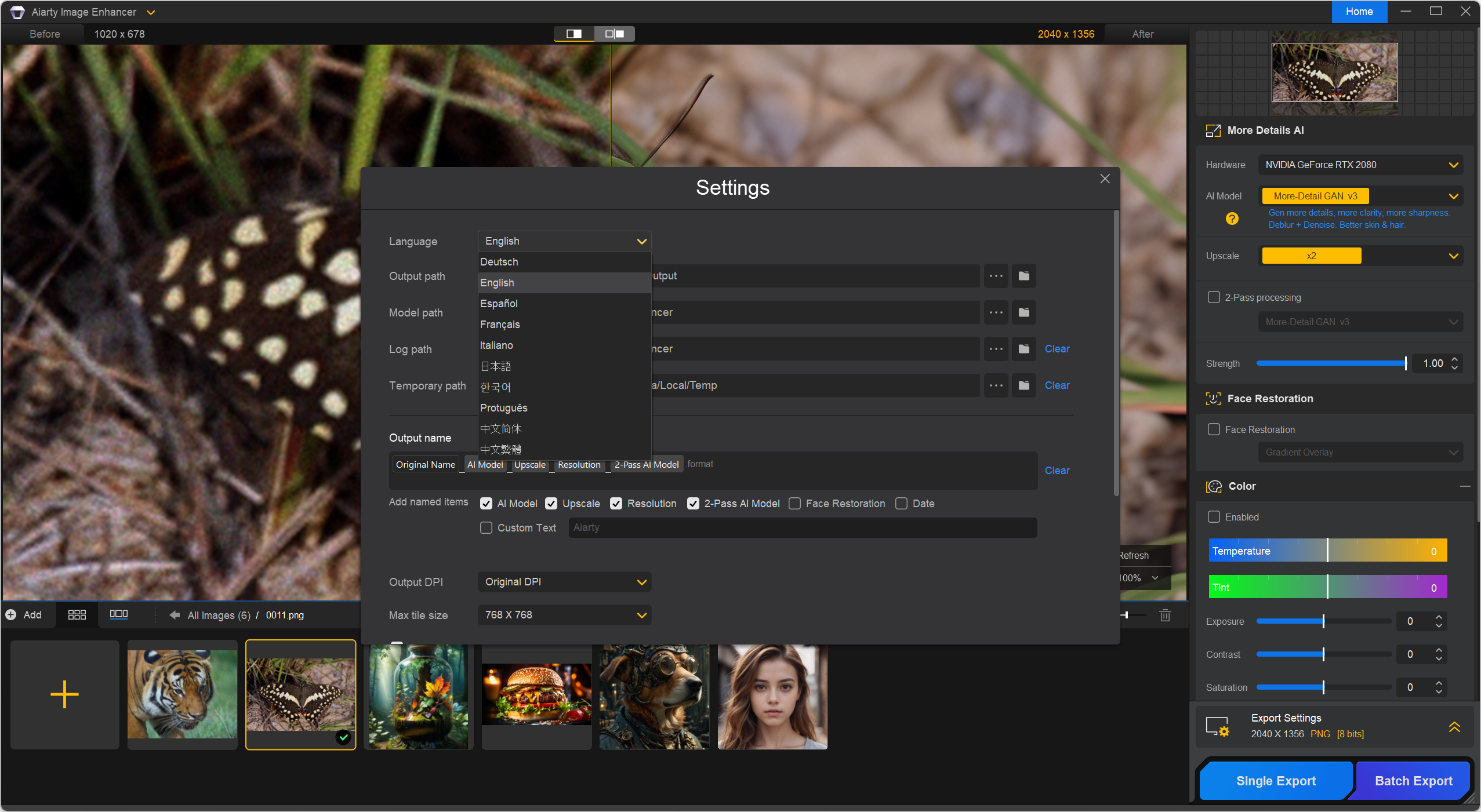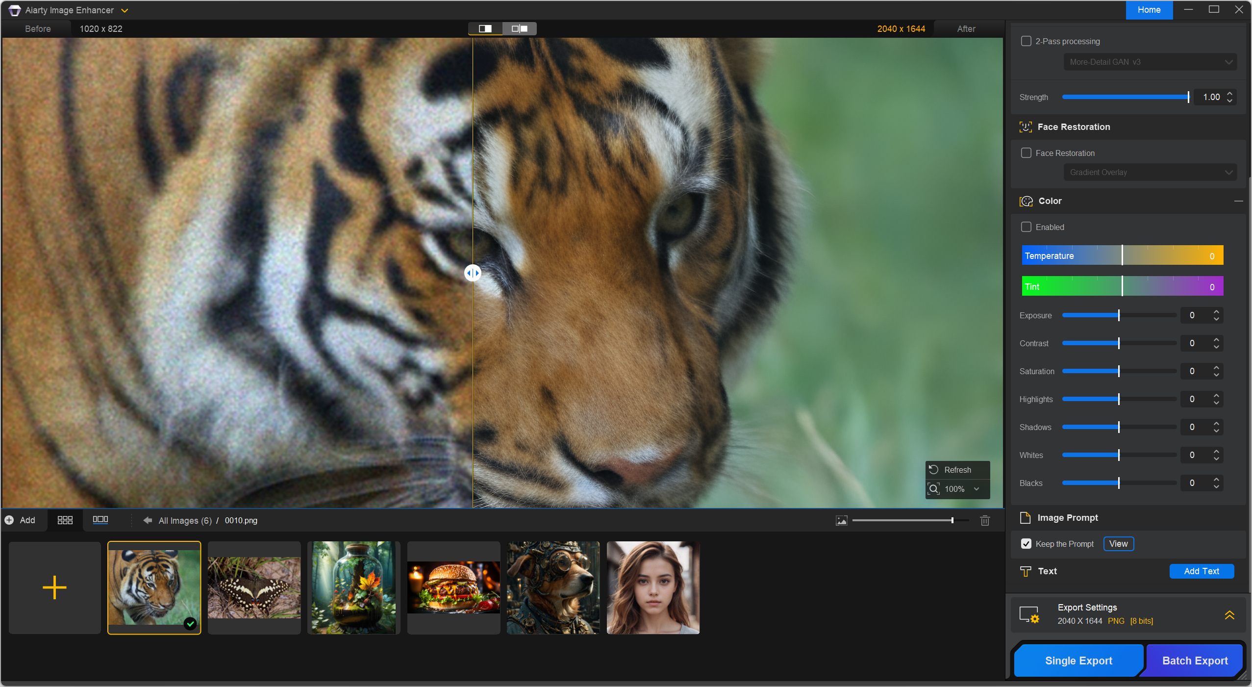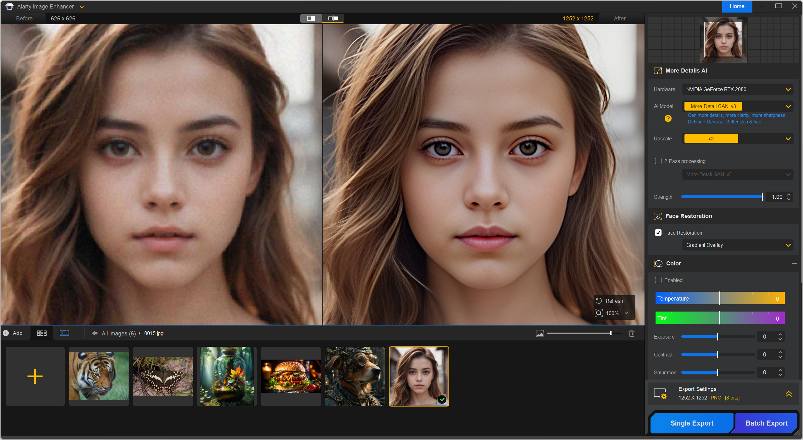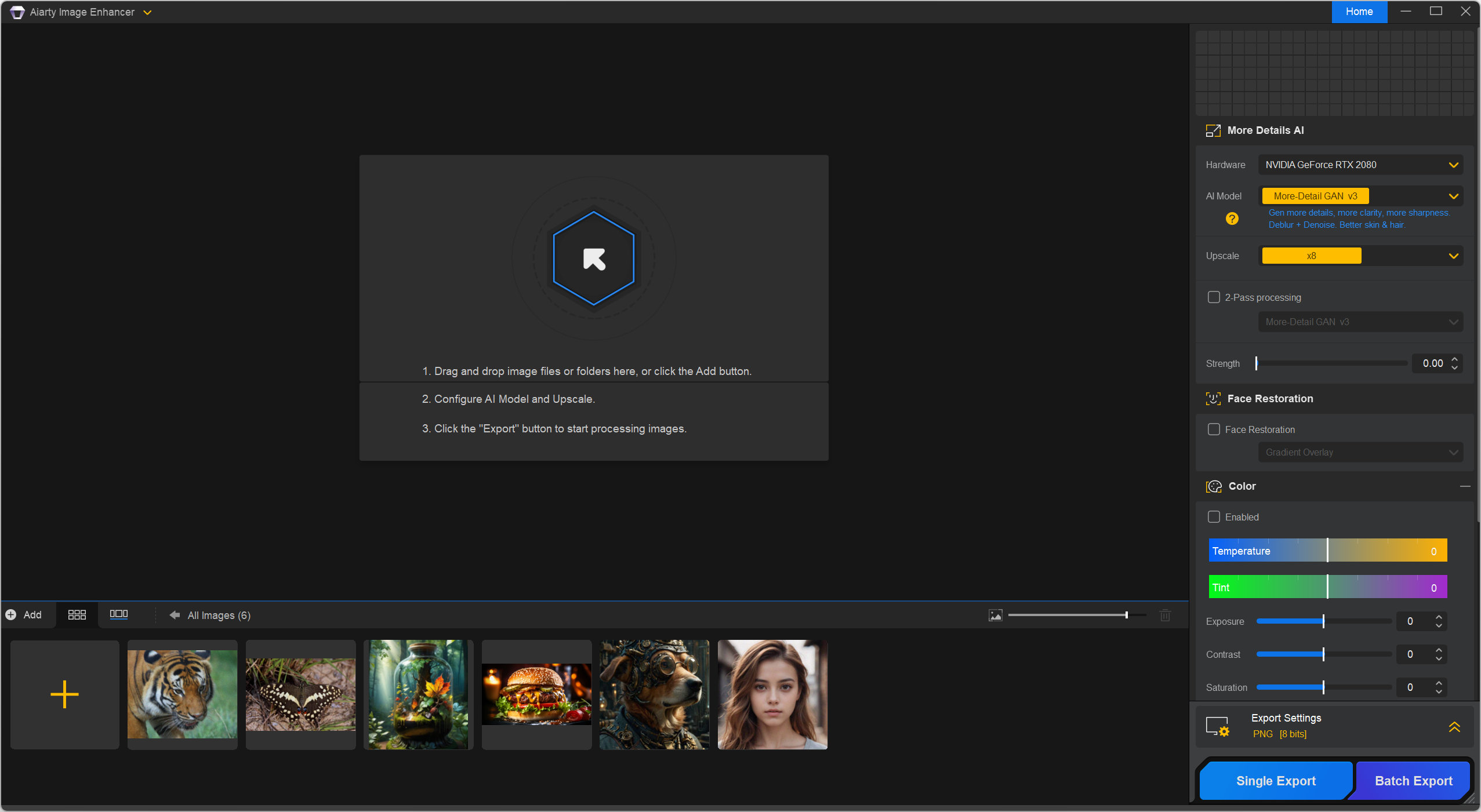 - Интегрированная цветокоррекция для ярких результатов: благодаря встроенной функции цветокоррекции, улучшение качества станет простым и доступным. Пользователи смогут точно настроить такие важные параметры, как цветовая температура, оттенок, экспозиция, контрастность и насыщенность, для улучшения тональности и усиления визуального эффекта. Этот инструмент позволяет добиваться потрясающих, ярких результатов прямо в рабочем процессе Aiarty, без необходимости использования дополнительного программного обеспечения для редактирования.